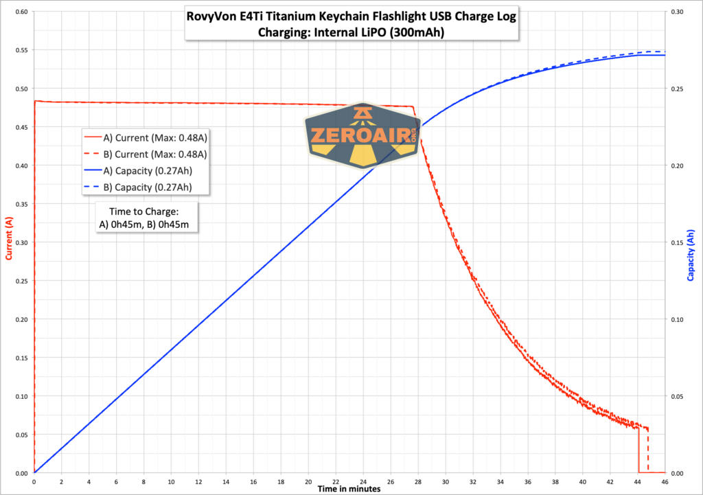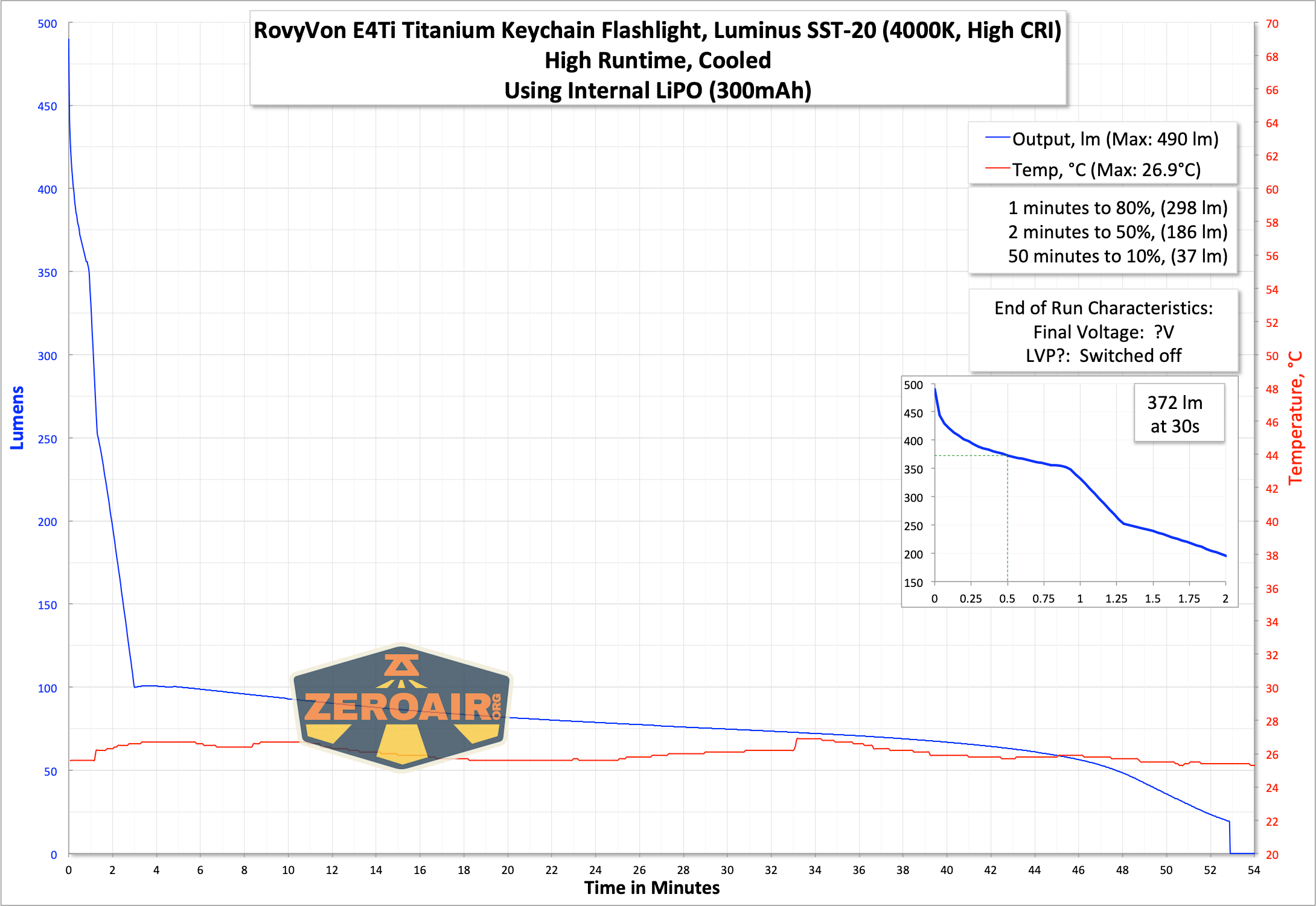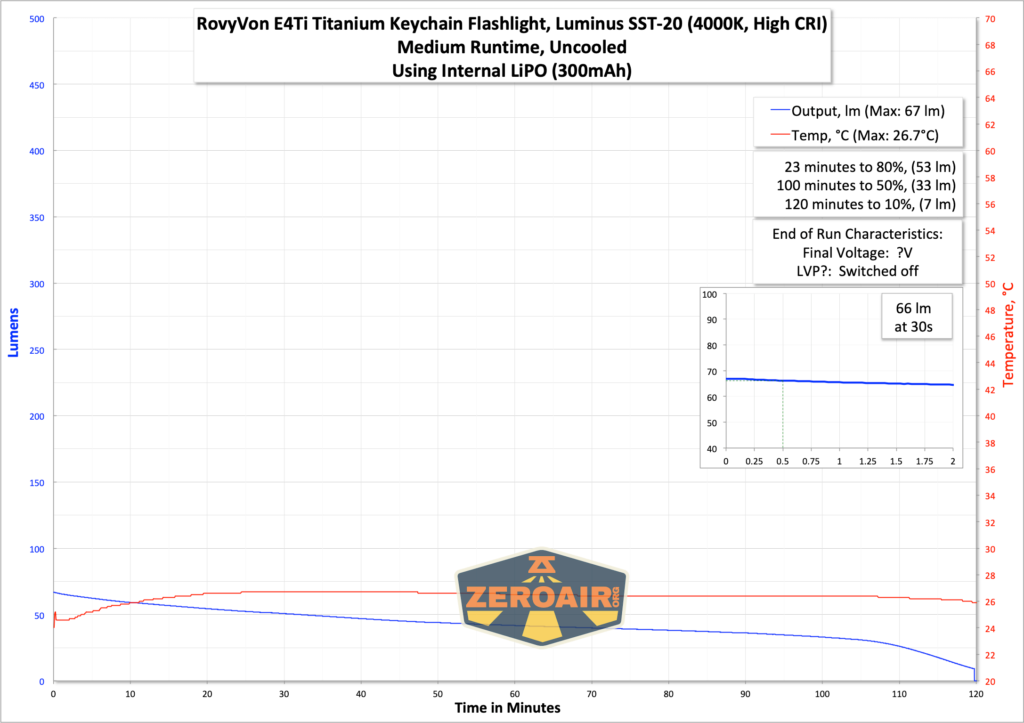 It seems like the AAA cell starts off with low output, and then around 70 minutes, the light switches to the internal LiPO. I don’t really have a way to confirm this, but I can say that the LiPO is depleted at the end of this runtime.
