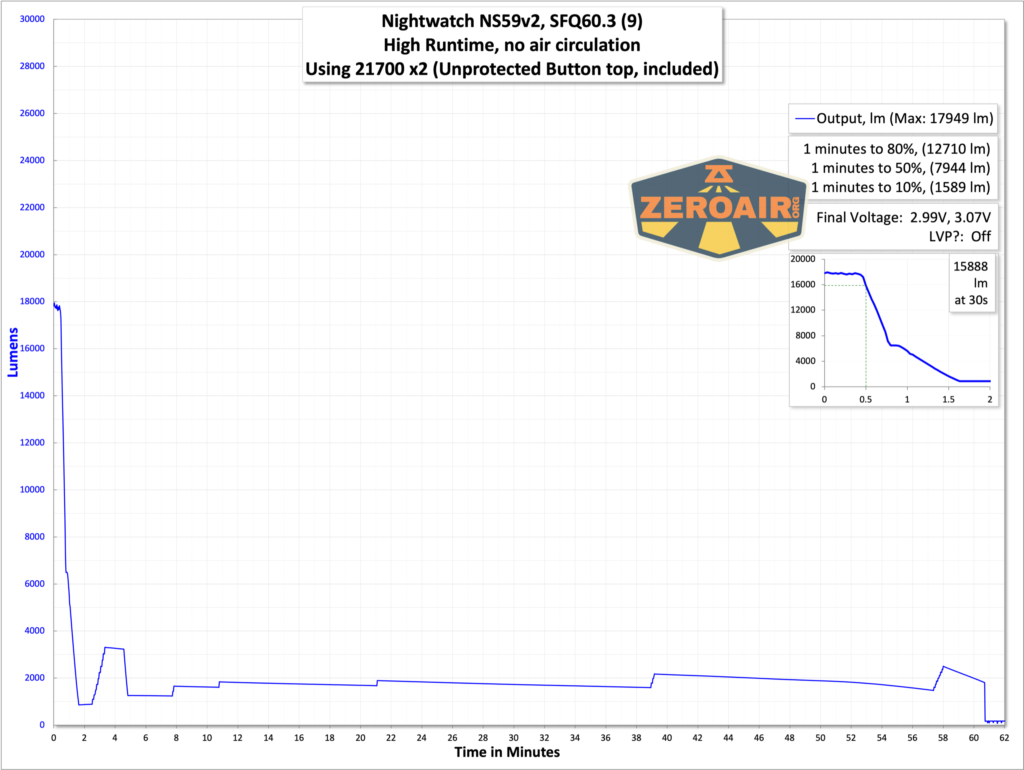 I’m sure the graph for mid level is wrong – it would never last nearly 8 hours @ that brightness on 2 21700 cells. If the brightnes is correct I believe that the time would be 10 times shorter – approx 46min.