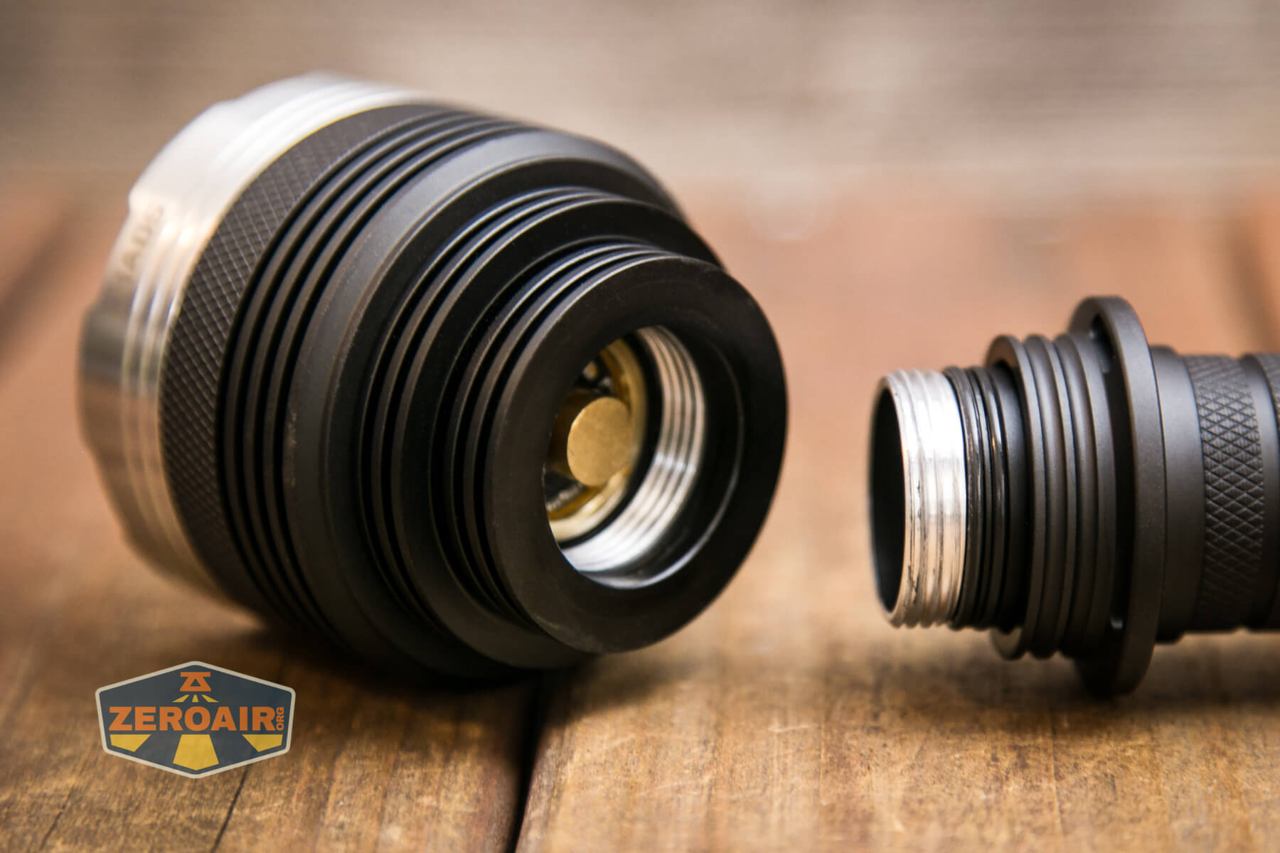 Threads on both head and tail are unanodized and square cut. They seem robust. Check out that brass contact point in the head. More on this later, but these parts all carry very high current, so it’s sensible that they’d be beefy.
