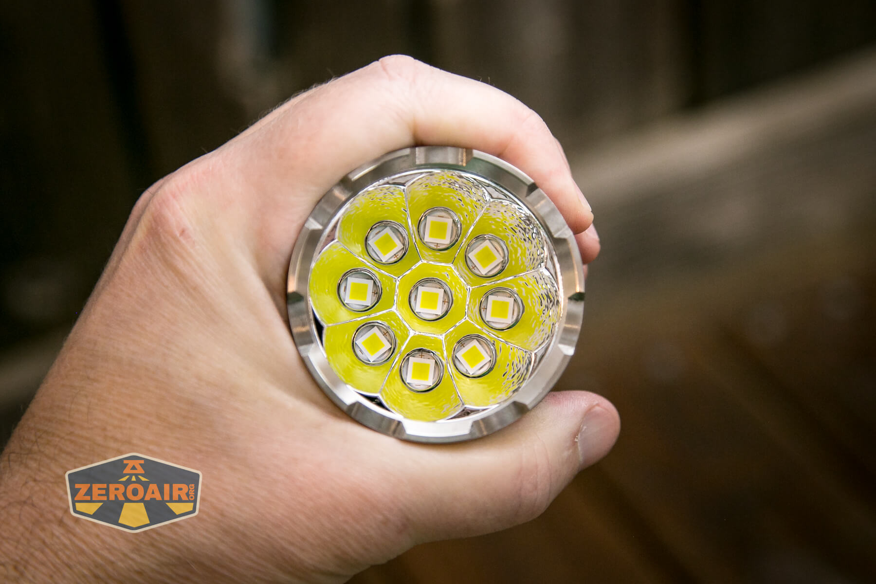 The Nightwatch NS59v2 Chaos flashlight uses nine emitters I’ve never had before! These are SFQ60.3 emitters. They’re domeless, which usually means good throw. But they also have a fairly large emitting surface, which reduces throw a bit. Either way, they’re great performers.