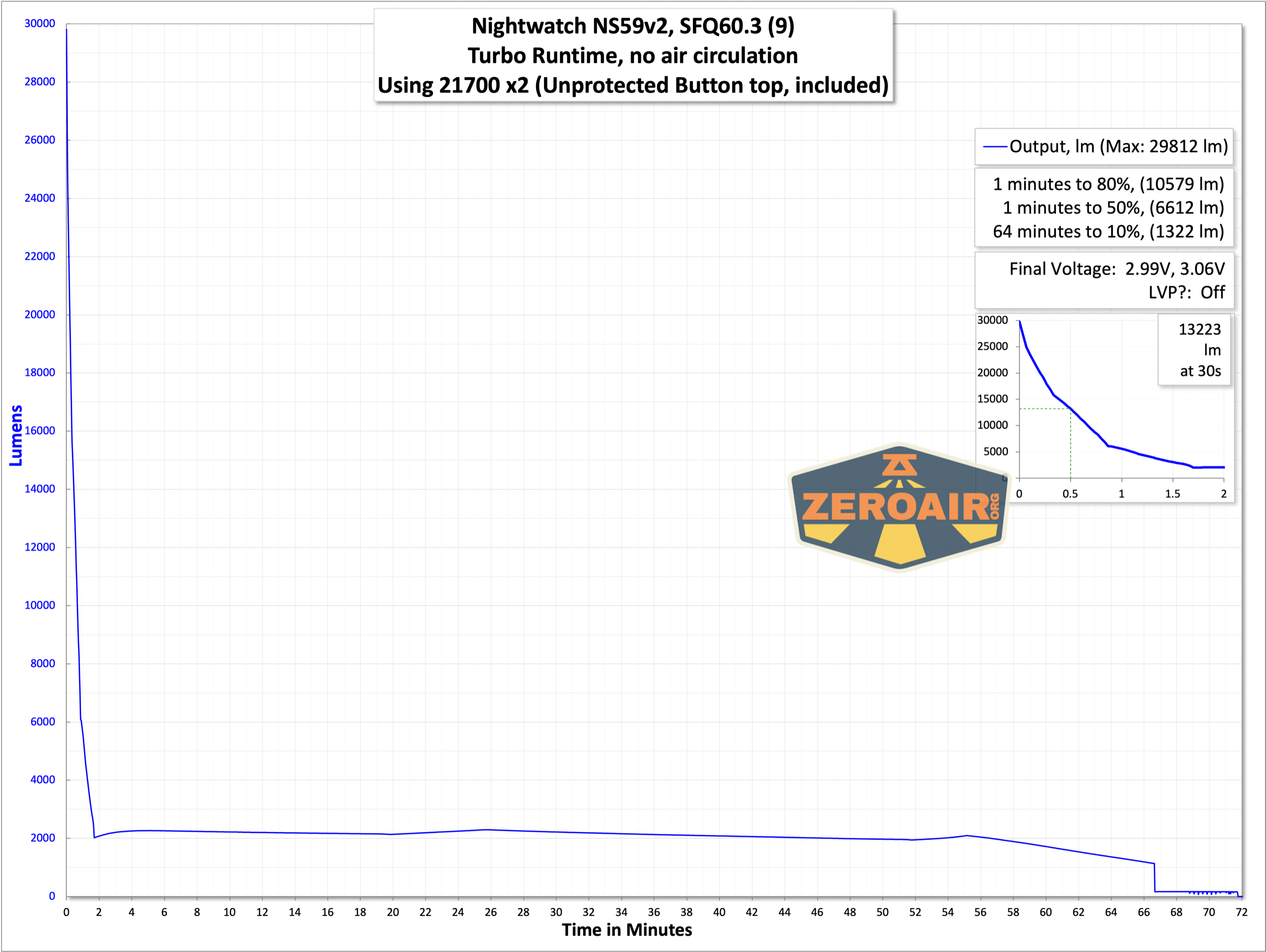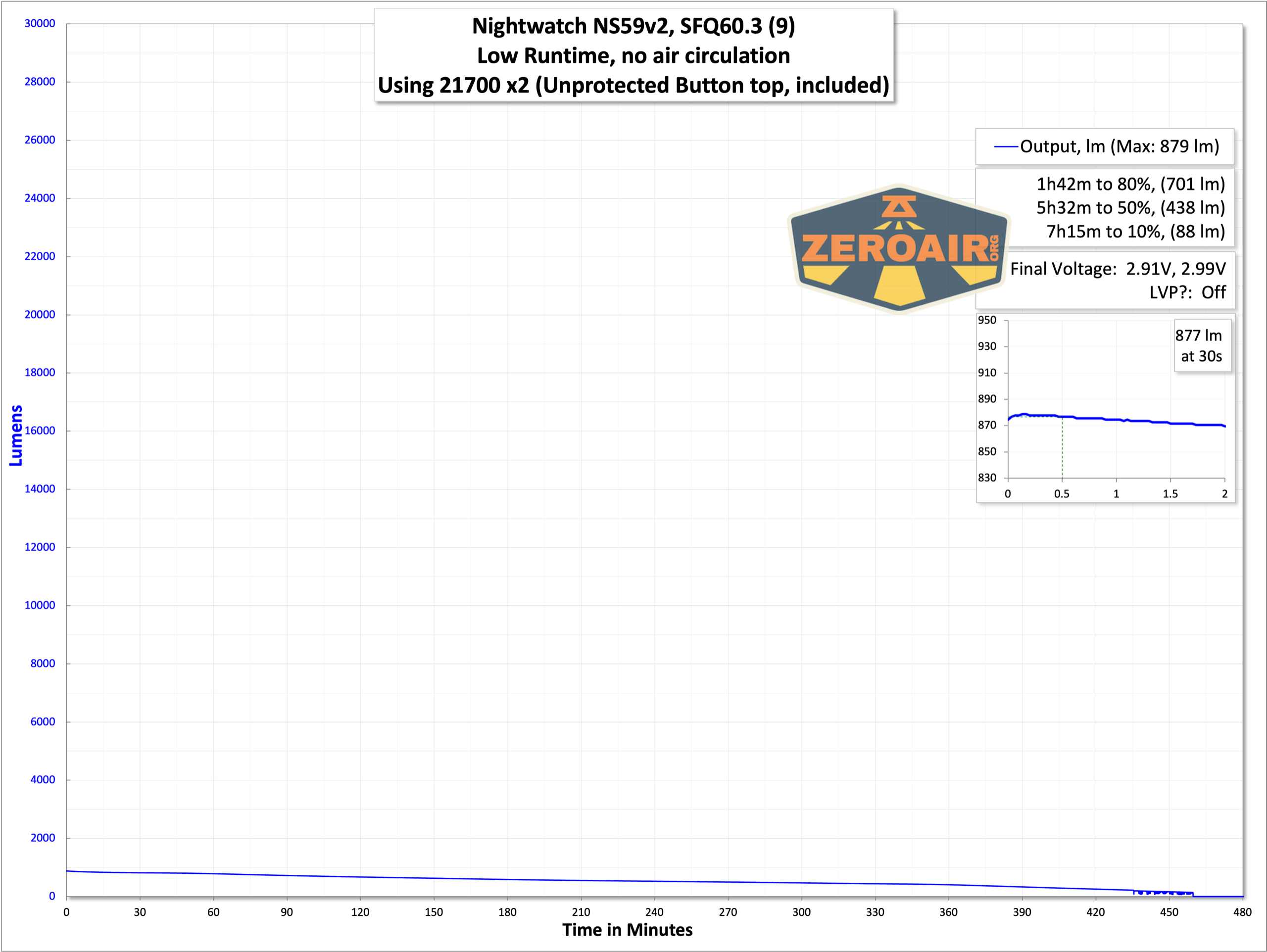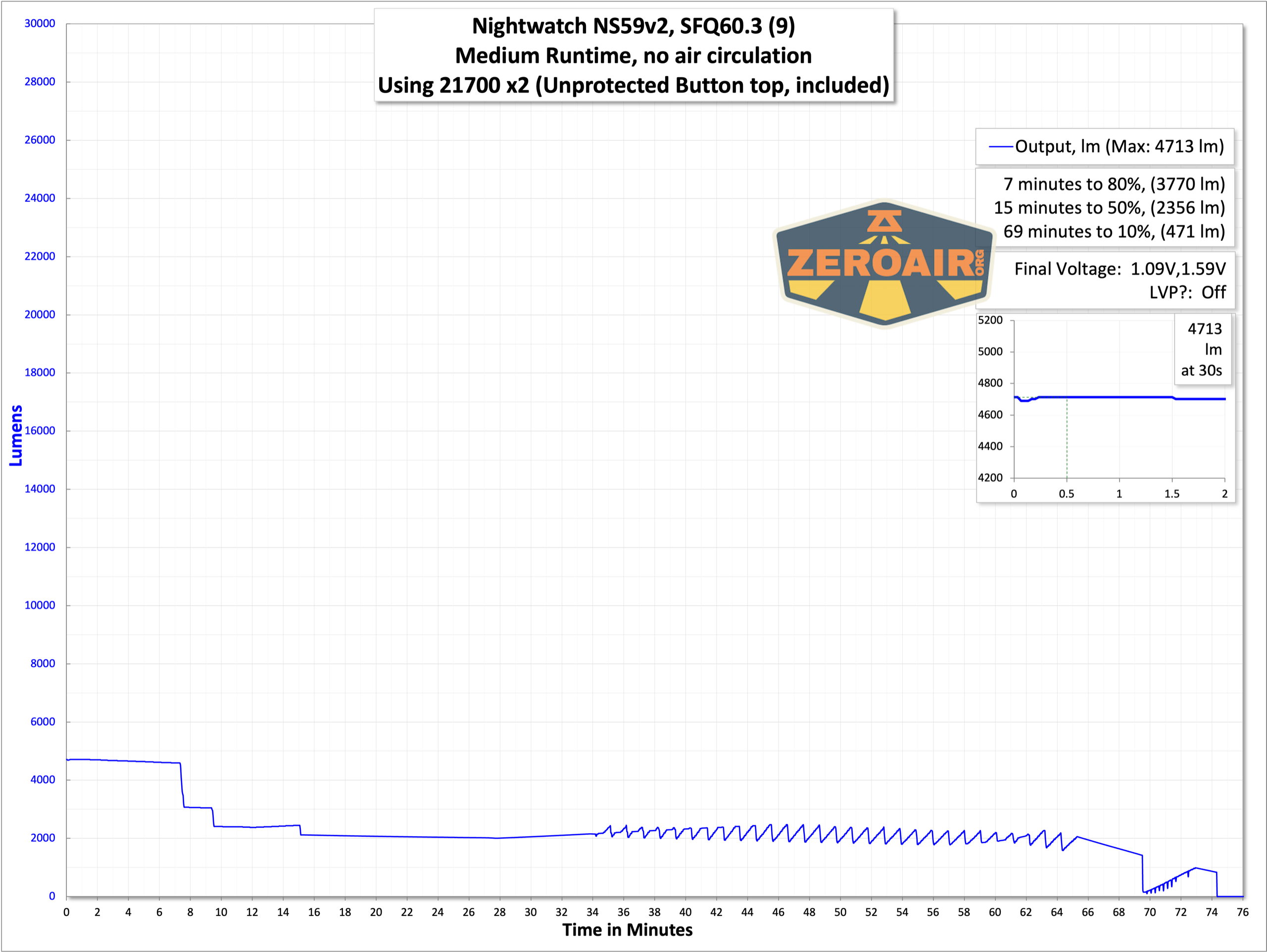 I’m sure the graph for mid level is wrong – it would never last nearly 8 hours @ that brightness on 2 21700 cells. If the brightnes is correct I believe that the time would be 10 times shorter – approx 46min.
