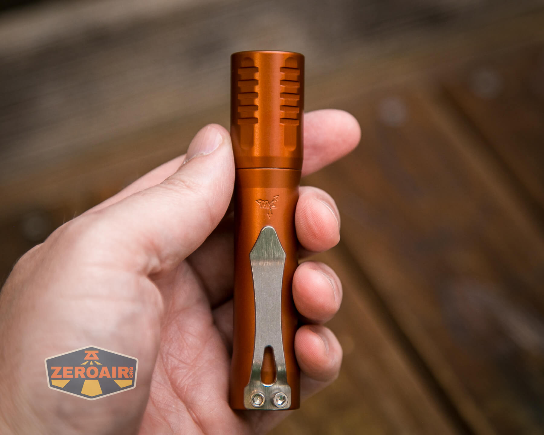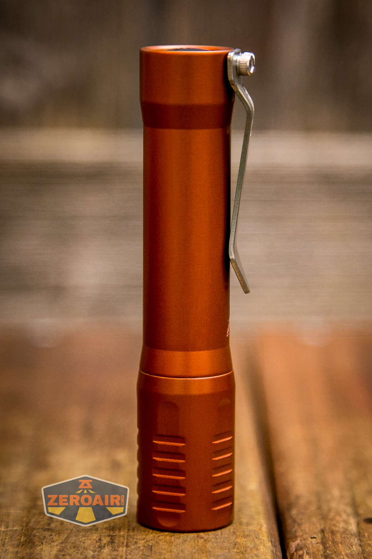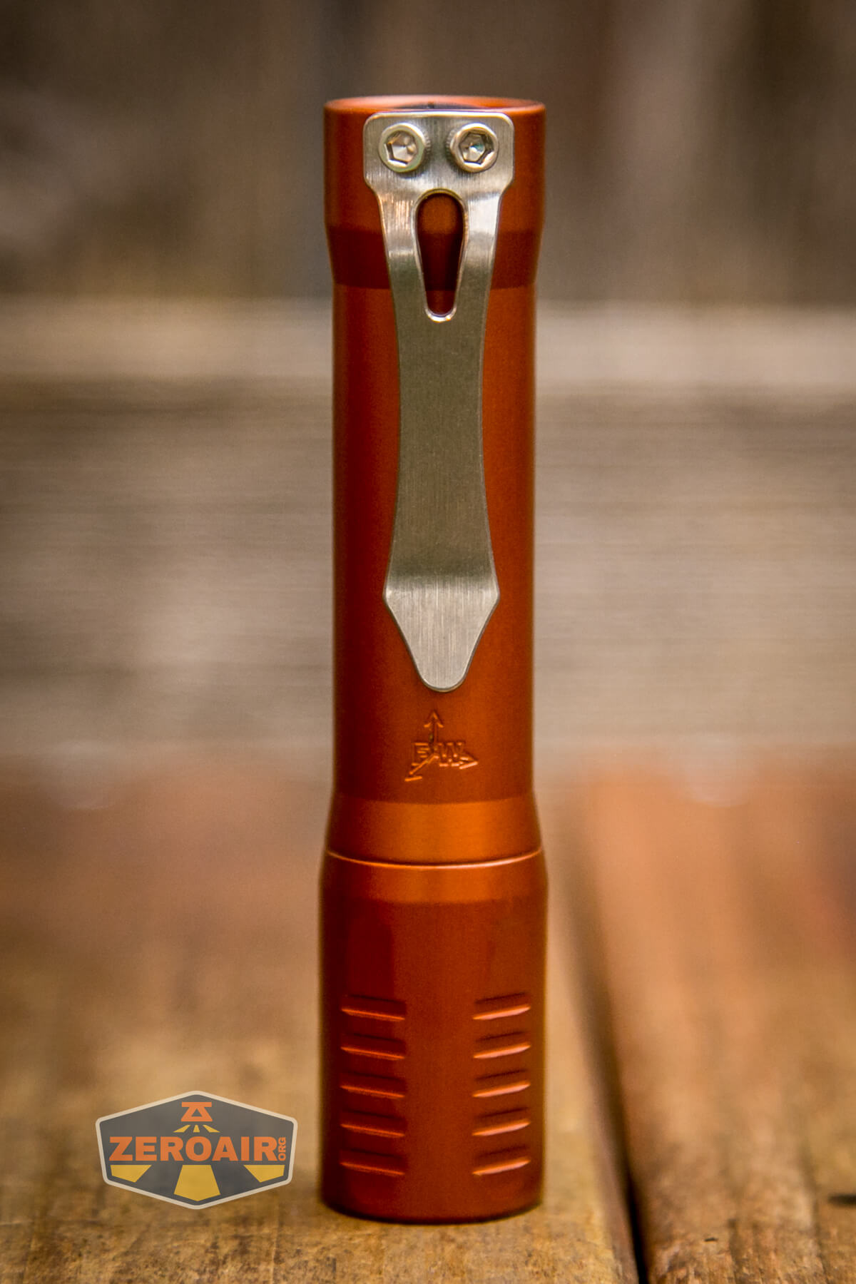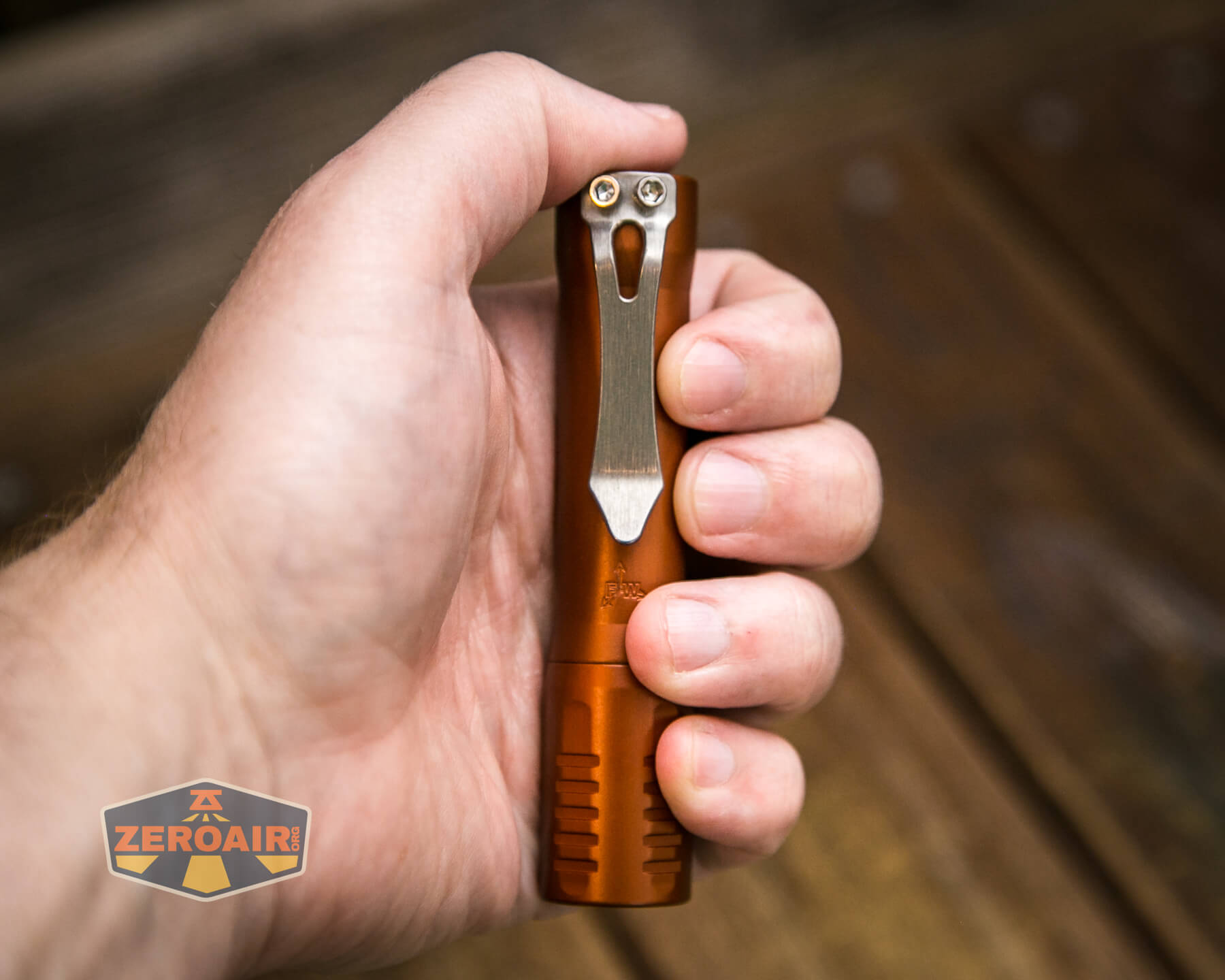 There are many finishes of the FocusWorks EDC F2 flashlight. This version is aluminum and finished in “Blood Orange” anodizing. Also available are cerakote versions and different metal versions, too. Jordy of FocusWorks has an interest in … everything, too, so if you have a wild hair idea for metals, you can probably get Jordy to make an F2 out of it!