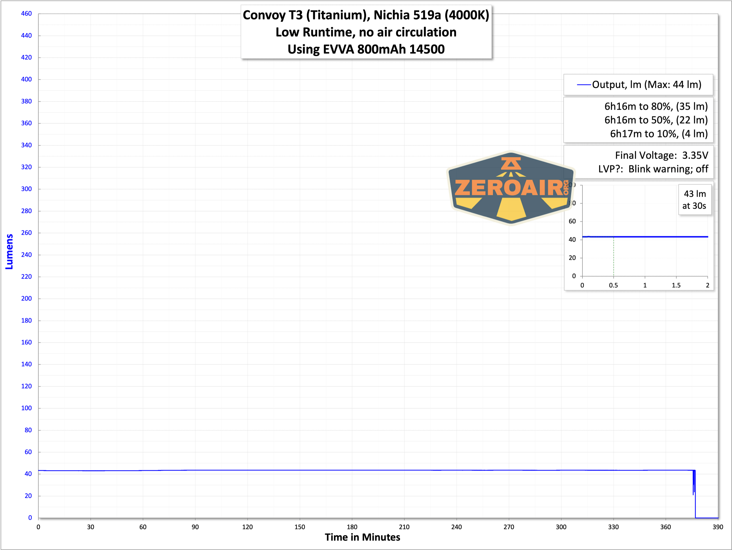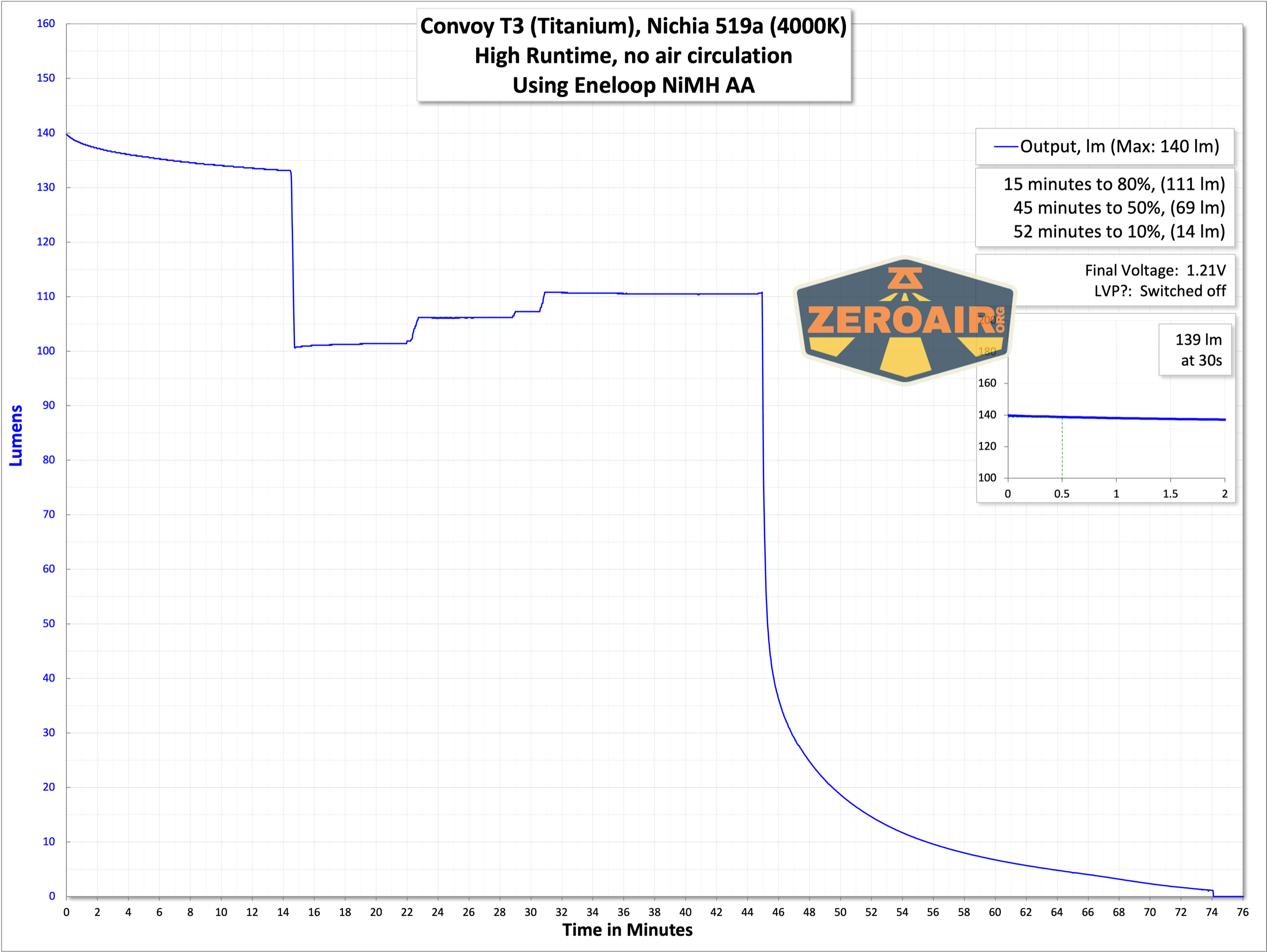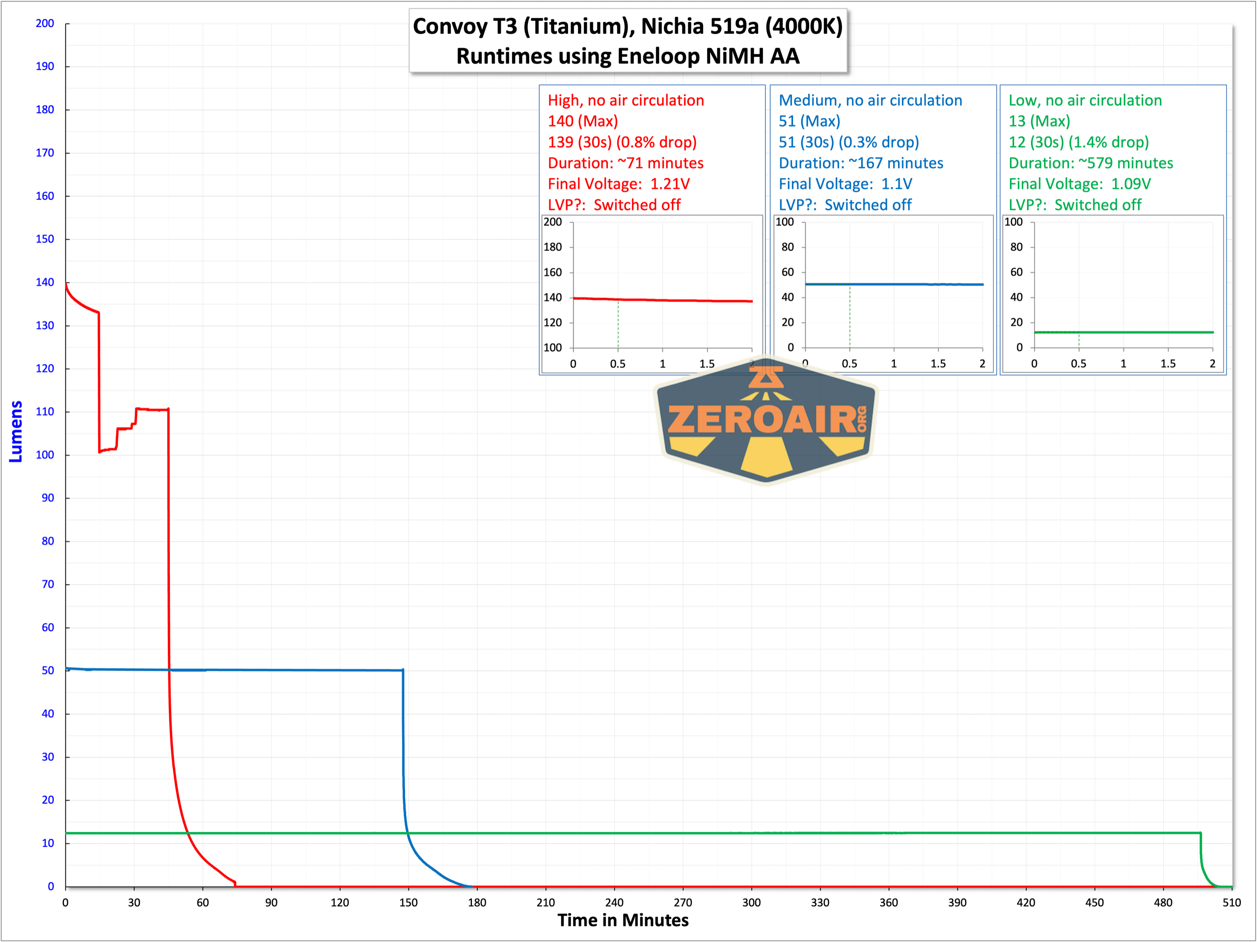 Below are a host of runtimes! There seems to be low voltage protection for both lithium-ion and NiMH cells, as well as a bit of blinking when the cell voltage gets low.