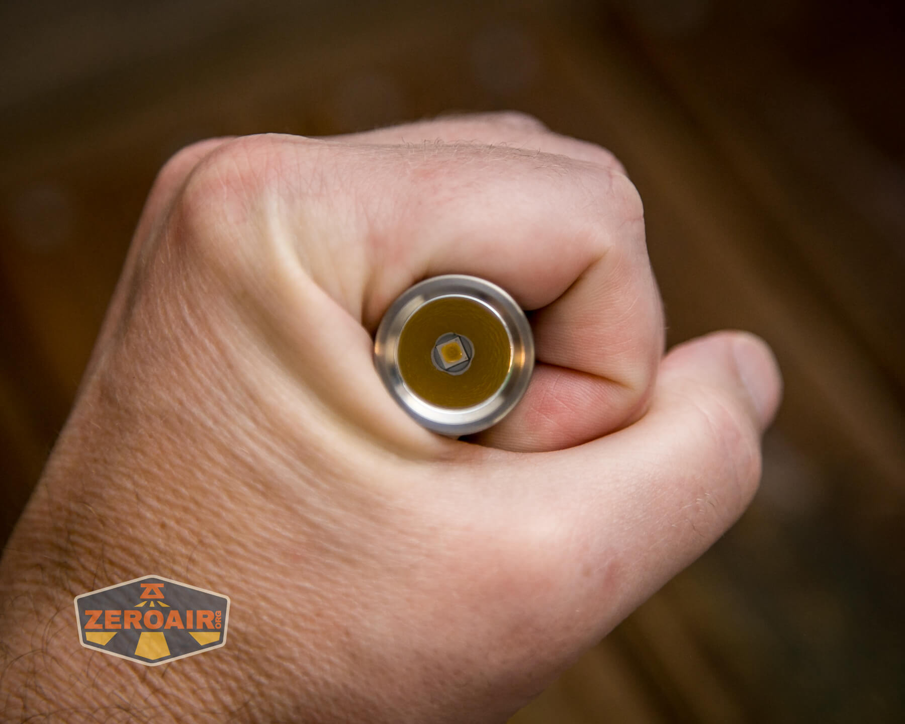 There’s a single switch on the Convoy T3 Titanium flashlight. This is a reverse mechanical clicky. A reverse clicky has the benefit of allowing mode changes while the light is on. But this also means that the switch does nothing until it is on – no momentary action whatsoever.