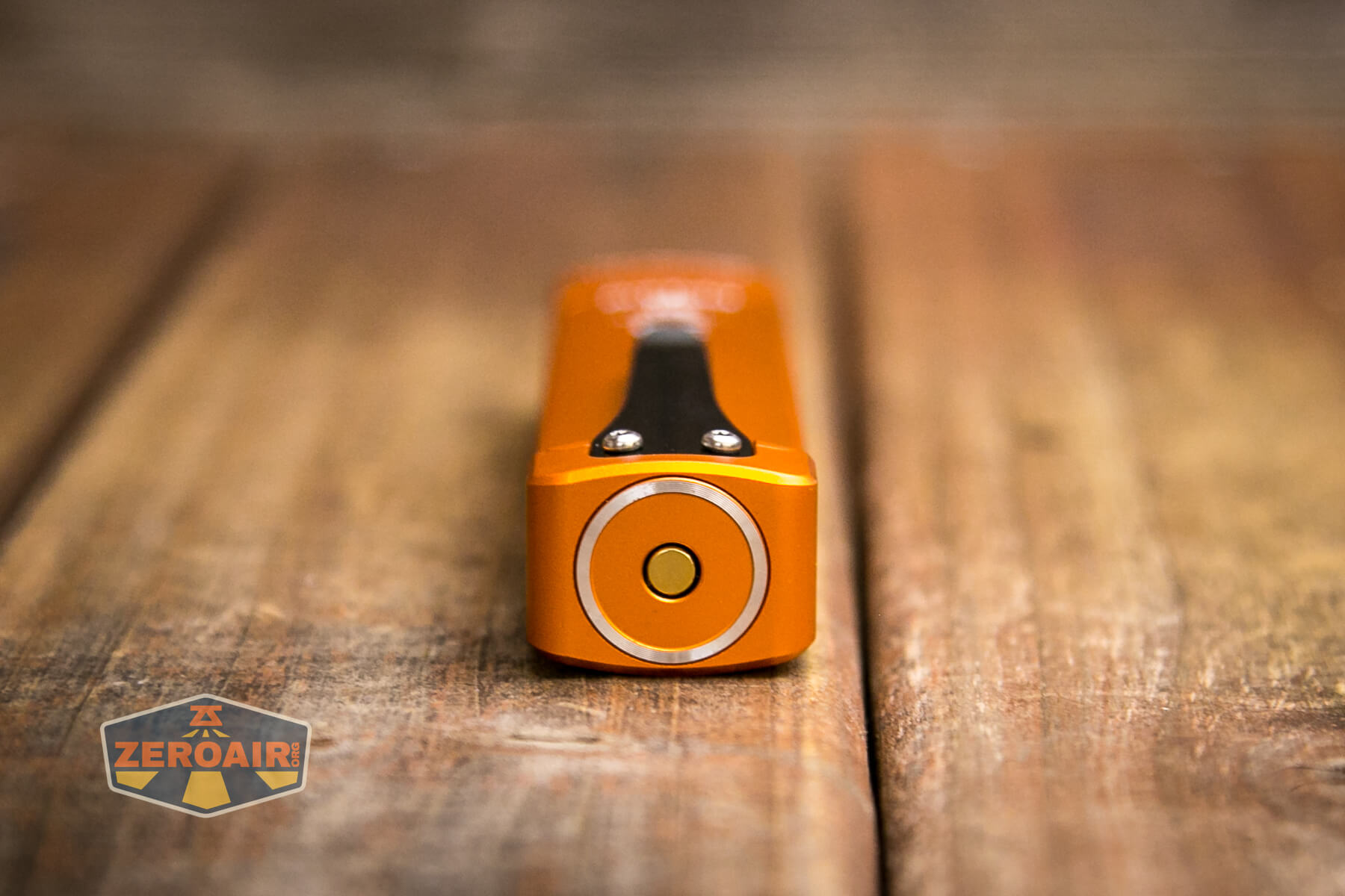 There’s also onboard charging, by way of a magnetic charge base and a magnetic charge connector in the tail (both parts are magnetic!). The charging base is the common Olight MCC, which can charge at 1A, 1.5A, or 2A.