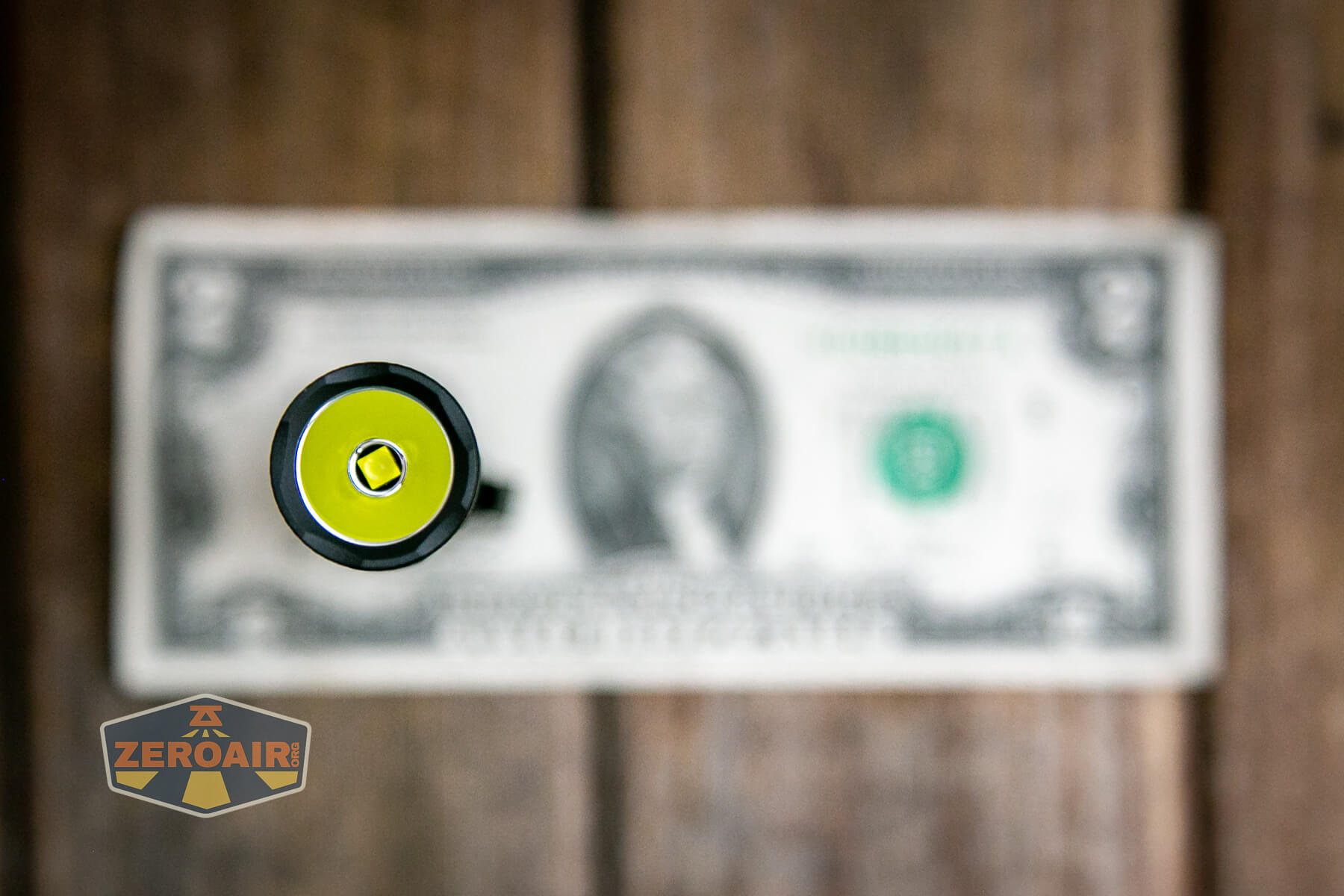 That emitter is coupled with a smooth reflector, and the bezel has a bit of a shape so that light will escape while headstanding.