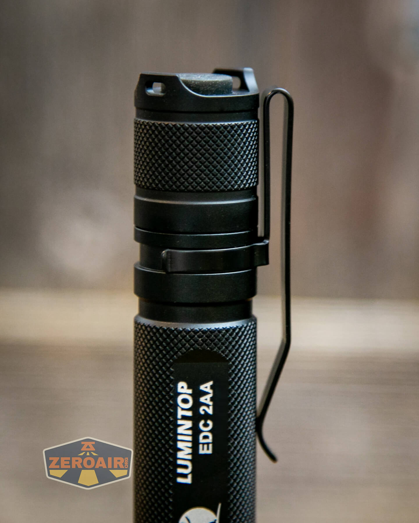 The Lumintop EDC 2AA flashlight has a friction-fit pocket clip.