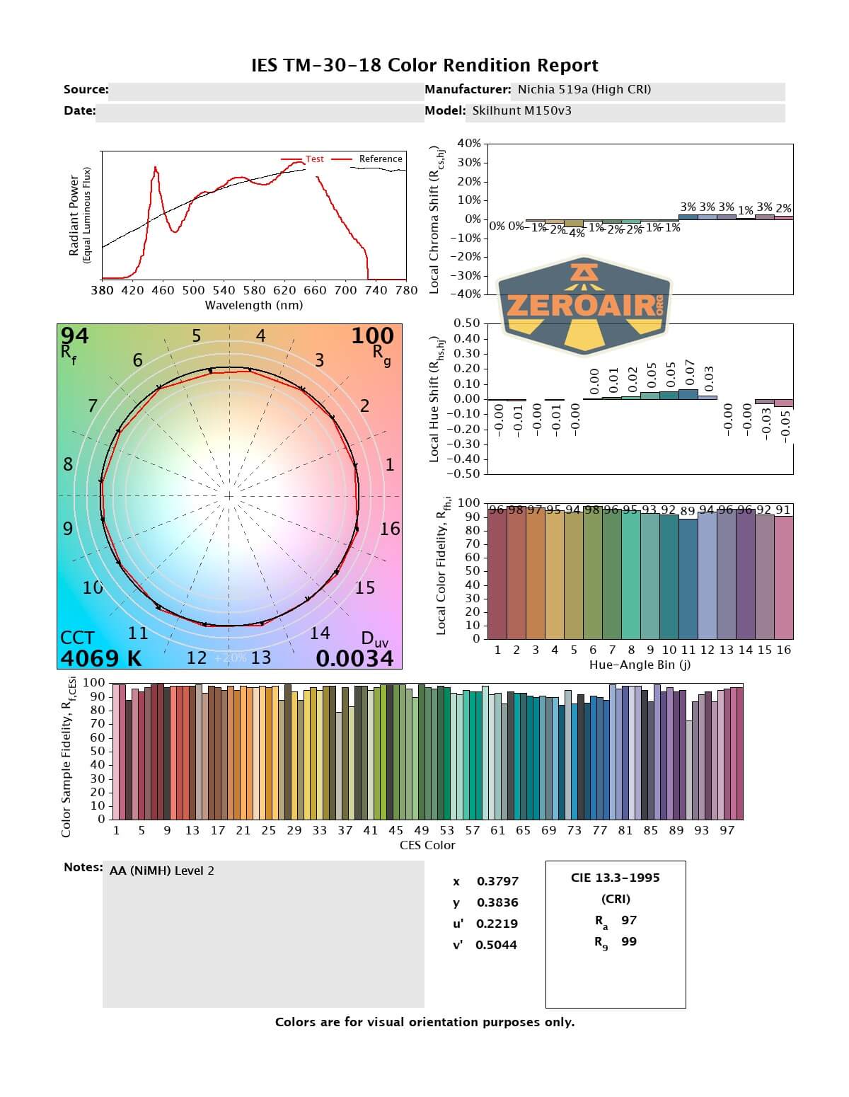 Check out those circles – the red and black circles. Black is “perfect” or “ideal” and the closer the red (test light) circle comes to the black, the better! This one is one of the best. Great CCT (around 4200K) and very high CRI, at around 97. 14500 first, then AA.