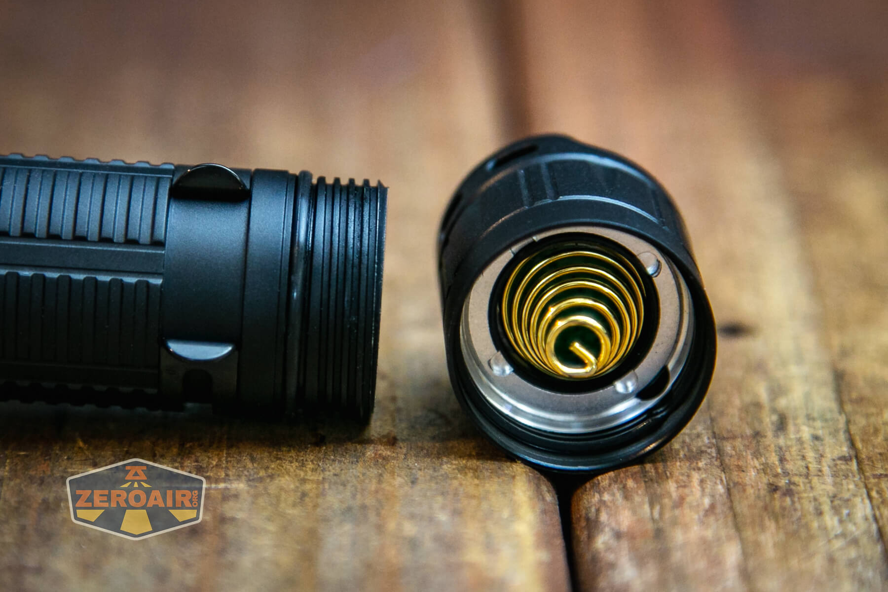 Below you can see the tailcap removed. The spring is just a little proud (and that’s fine). The threads are square-cut, anodized, and lightly lubed.
