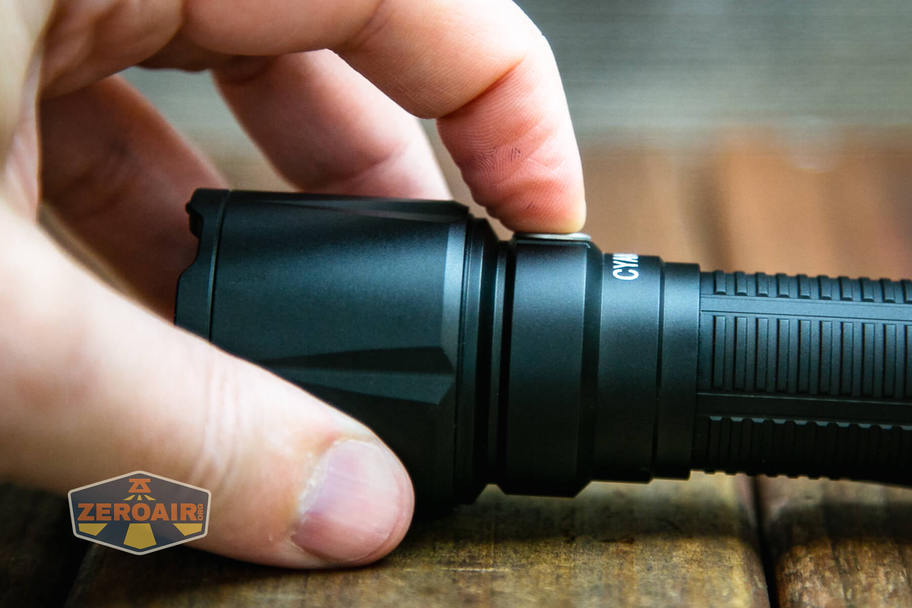 Two switches are used for control of the Cyansky K3 V2 tactical flashlight. First is the mechanical tail clicky. It’s a forward clicky, which allows momentary actuation. This switch also serves as a mechanical lockout to prevent any parasitic drain on the cell