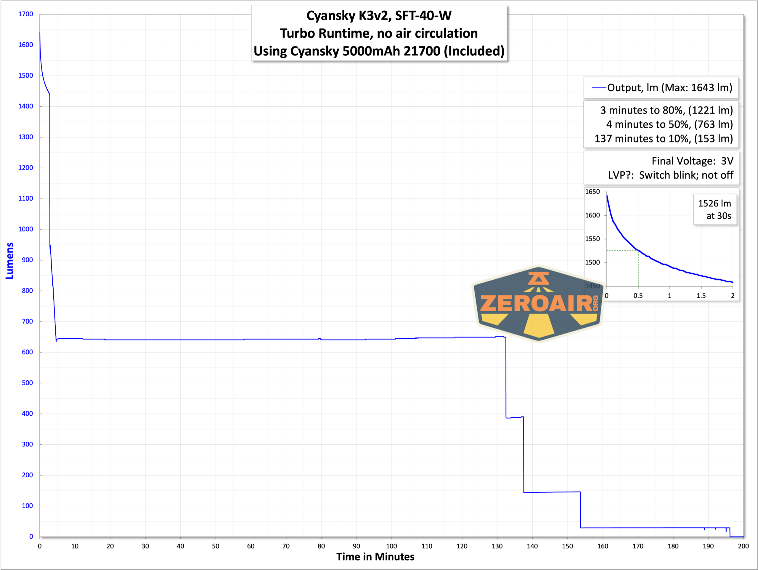 Below are a few runtime tests. You’ll note the big stepdown in turbo – I’d like to see this held a bit longer and a bit higher. Also, the subsequent modes are a bit lower than they probably could be. “High” of 400 lumens seems anemic.