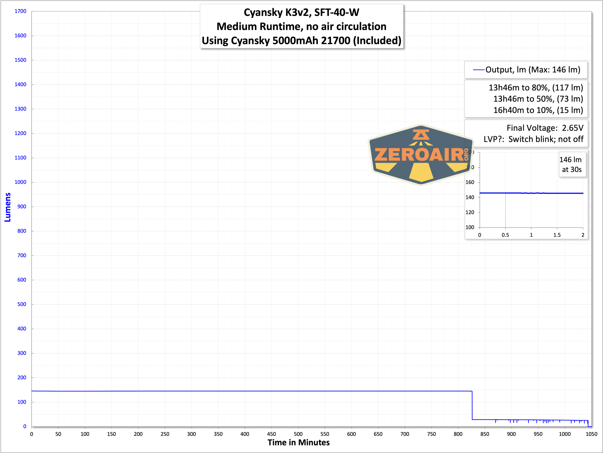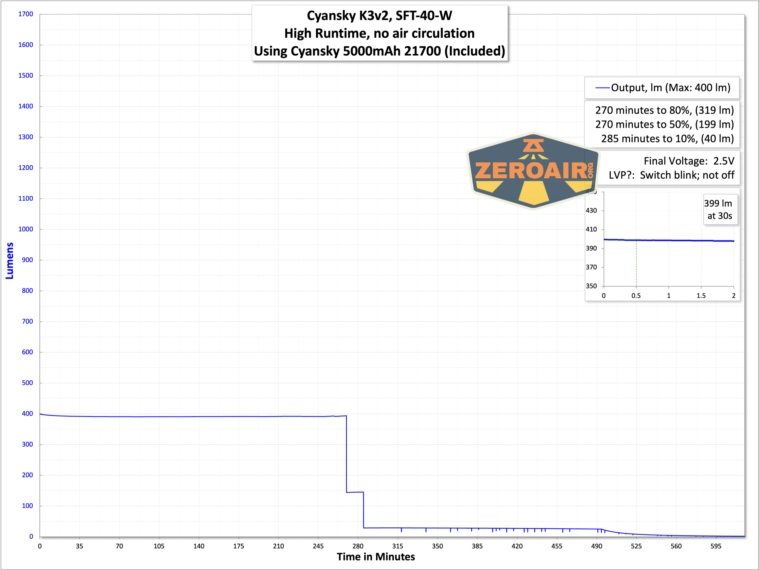 In the runtime graphs above, I did not really observe low voltage protection. This is sort of to be expected with a tactical flashlight. The light steps down to “very low output” at around 2.6V and then finally shuts off (ish) at 2.5V.