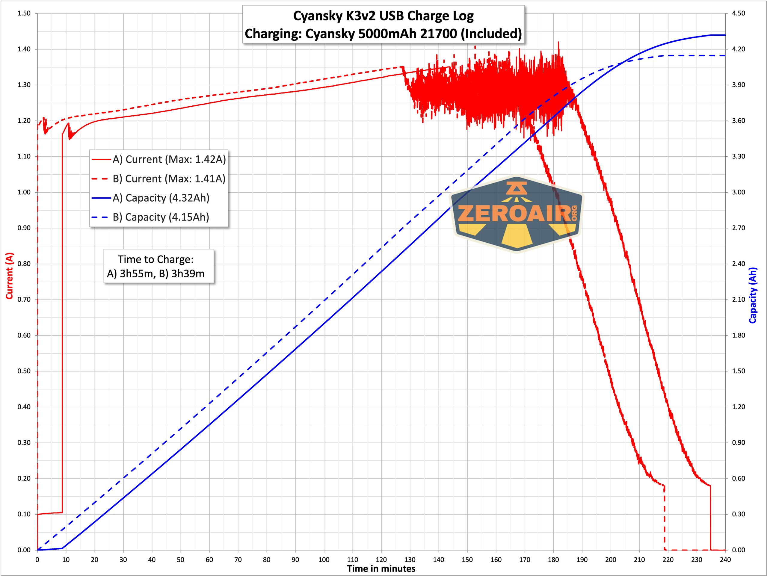Charging proceeds at a fairly slow 1.5A or so, which is well under 0.5C for this 5000mAh cell. The time required is around 3 hours, and the terminal voltage seems to be consistently 4.19V, a very good termination voltage.