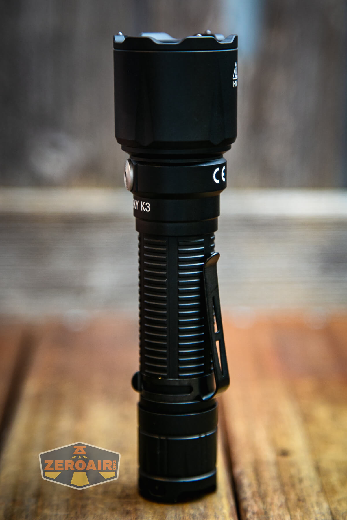 The second option for operation is the e-switch on the side near the head. This switch is metal(ish?) and very proud. Also, it doesn’t compete with anything else, so it’s very easy to find without looking. Notably, this switch (cover) is improved from lights like the H3, which is otherwise a very similar flashlight. Another notable aspect of this V2 edition of the K3 is that this switch has an indication function! Upon powering the light on, the switch will indicate as follows: