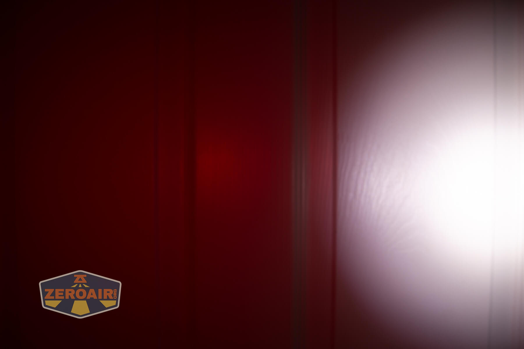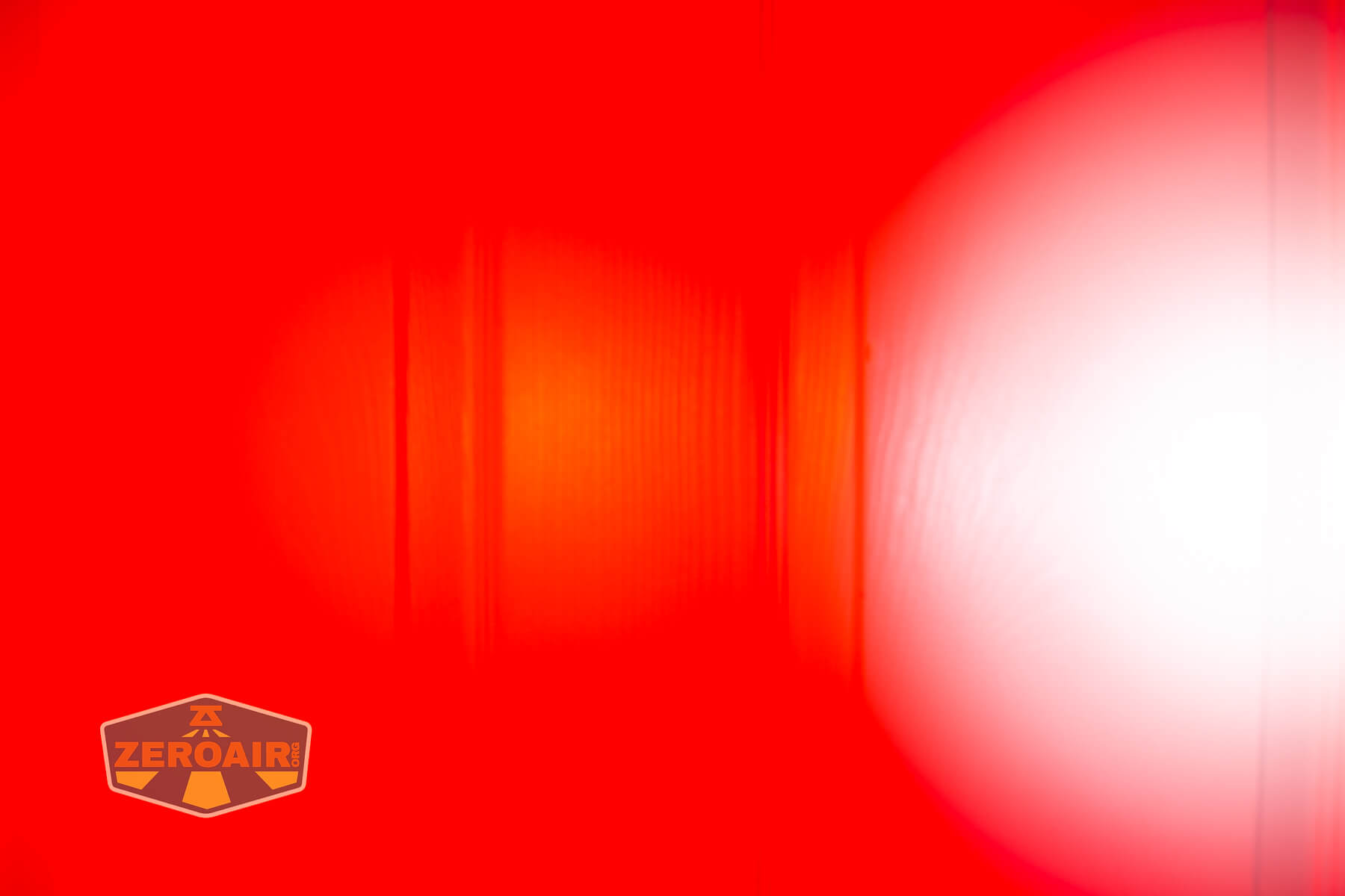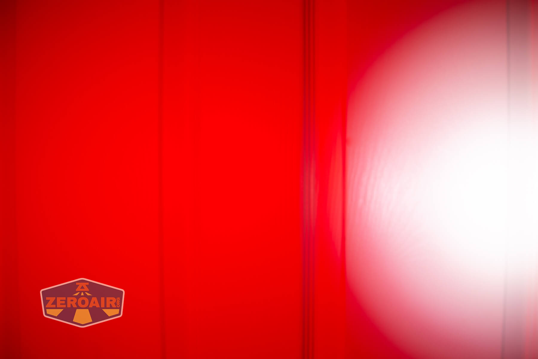 These beamshots always have the following settings: f8, ISO100, 0.3s shutter, and manual 5000K exposure. These photos are taken at floor level, and the beam hits the ceiling around 9 feet away. As above: warm white in the top row. Cool white in the middle row. Red in the bottom row.