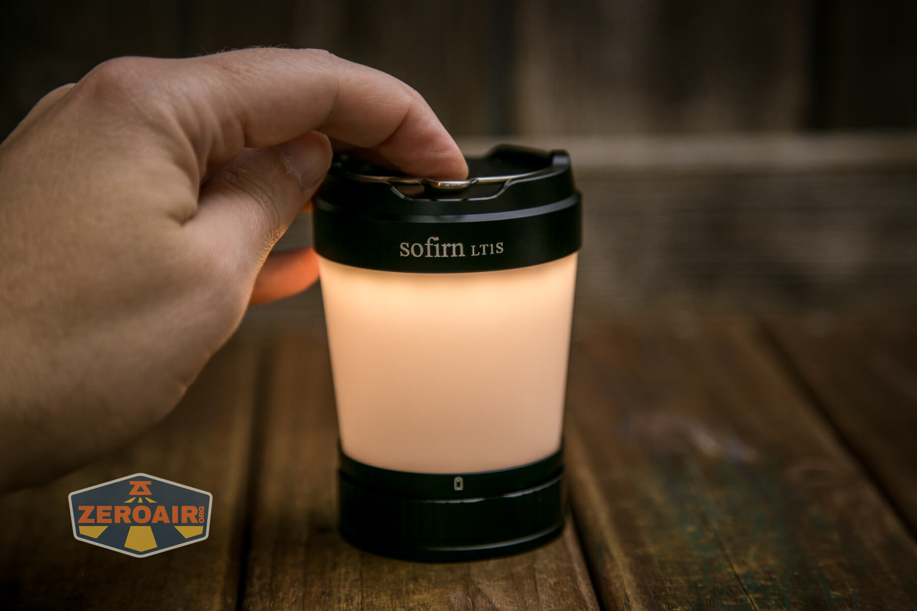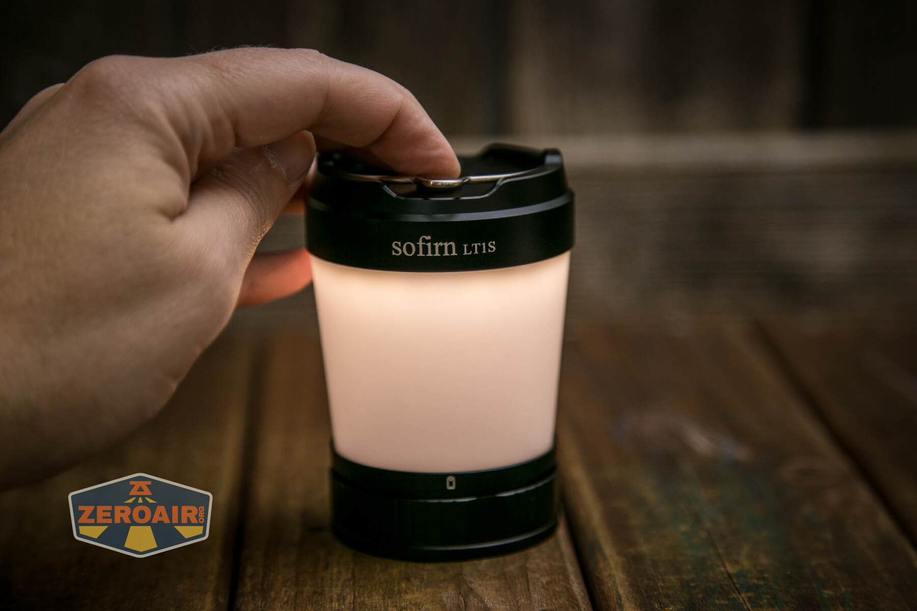 A single switch controls the Sofirn LT1S lantern. That e-switch is on the top of the lantern and is covered by a knurled rubber boot.