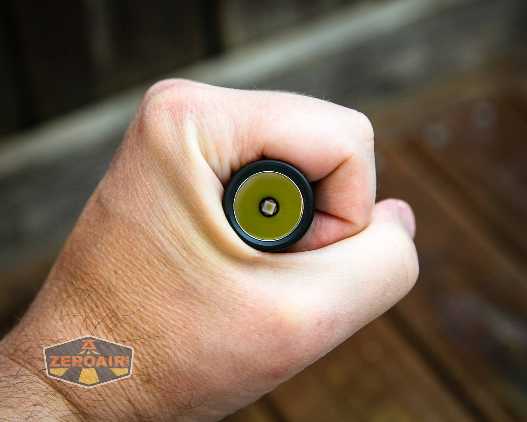 Control of the Lumintop PK27 flashlight is by a single mechanical tail switch. It’s a reverse clicky, so when the light is on, mode changes are possible.