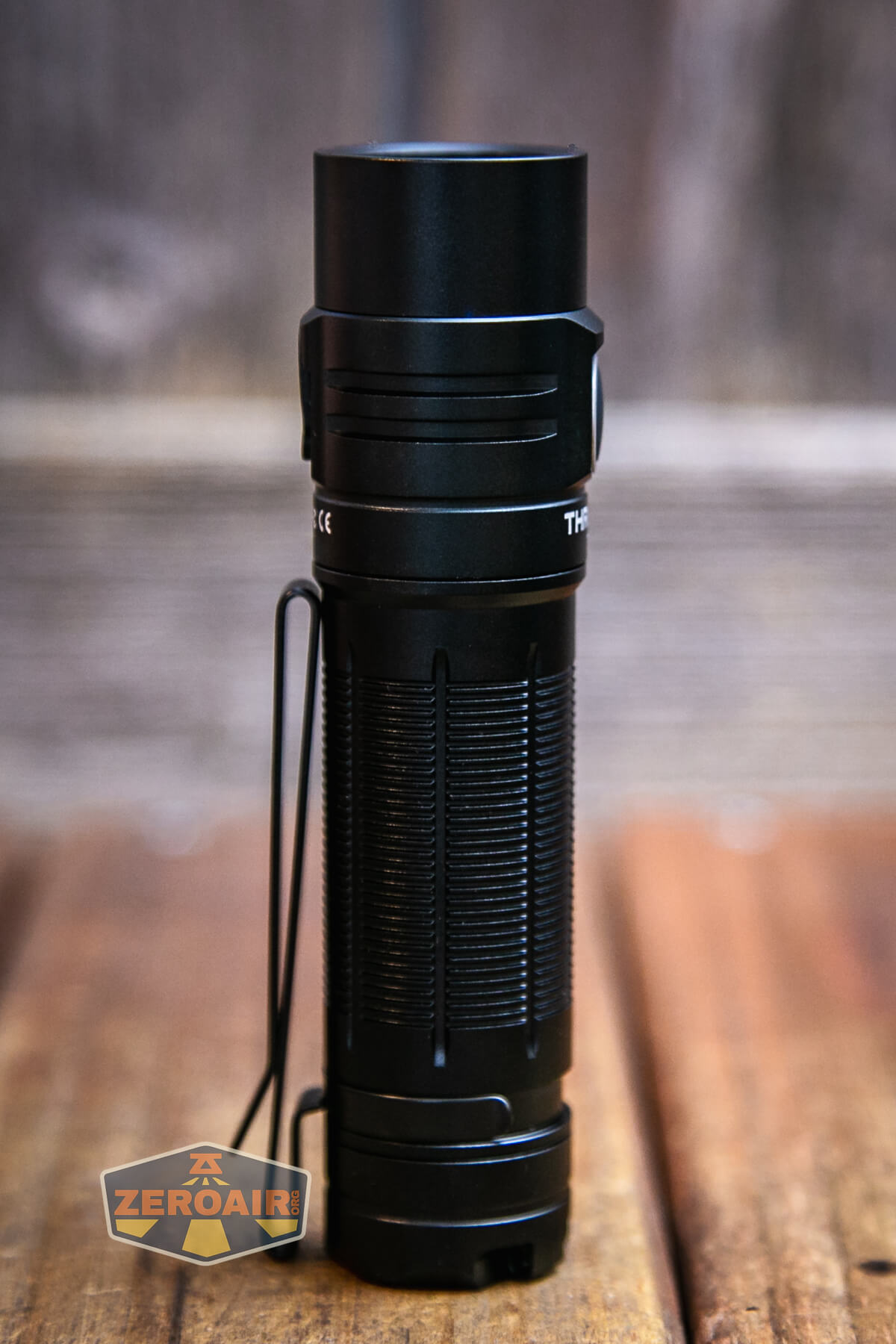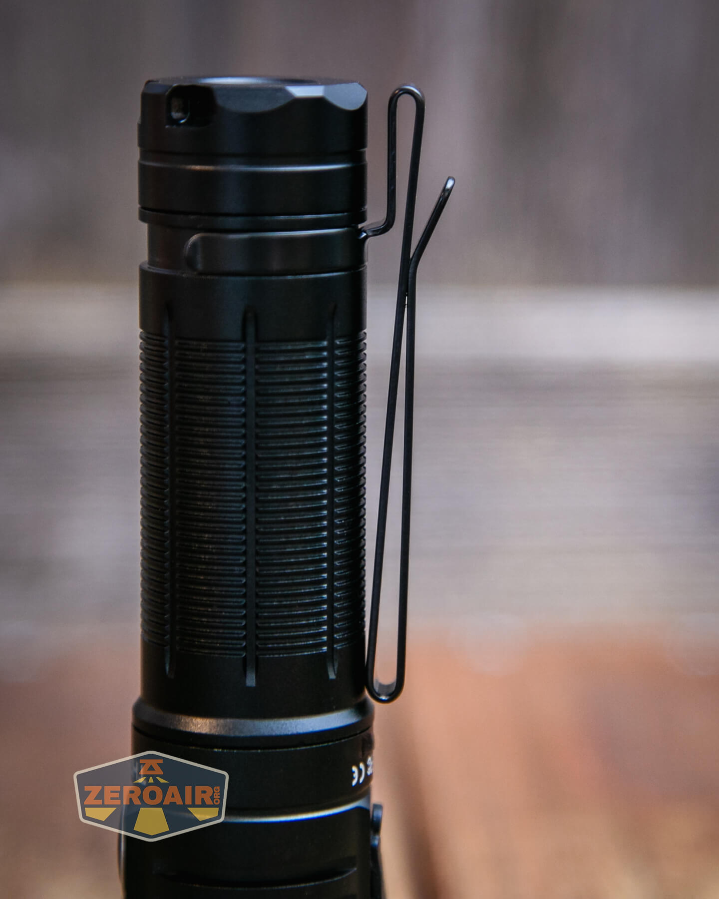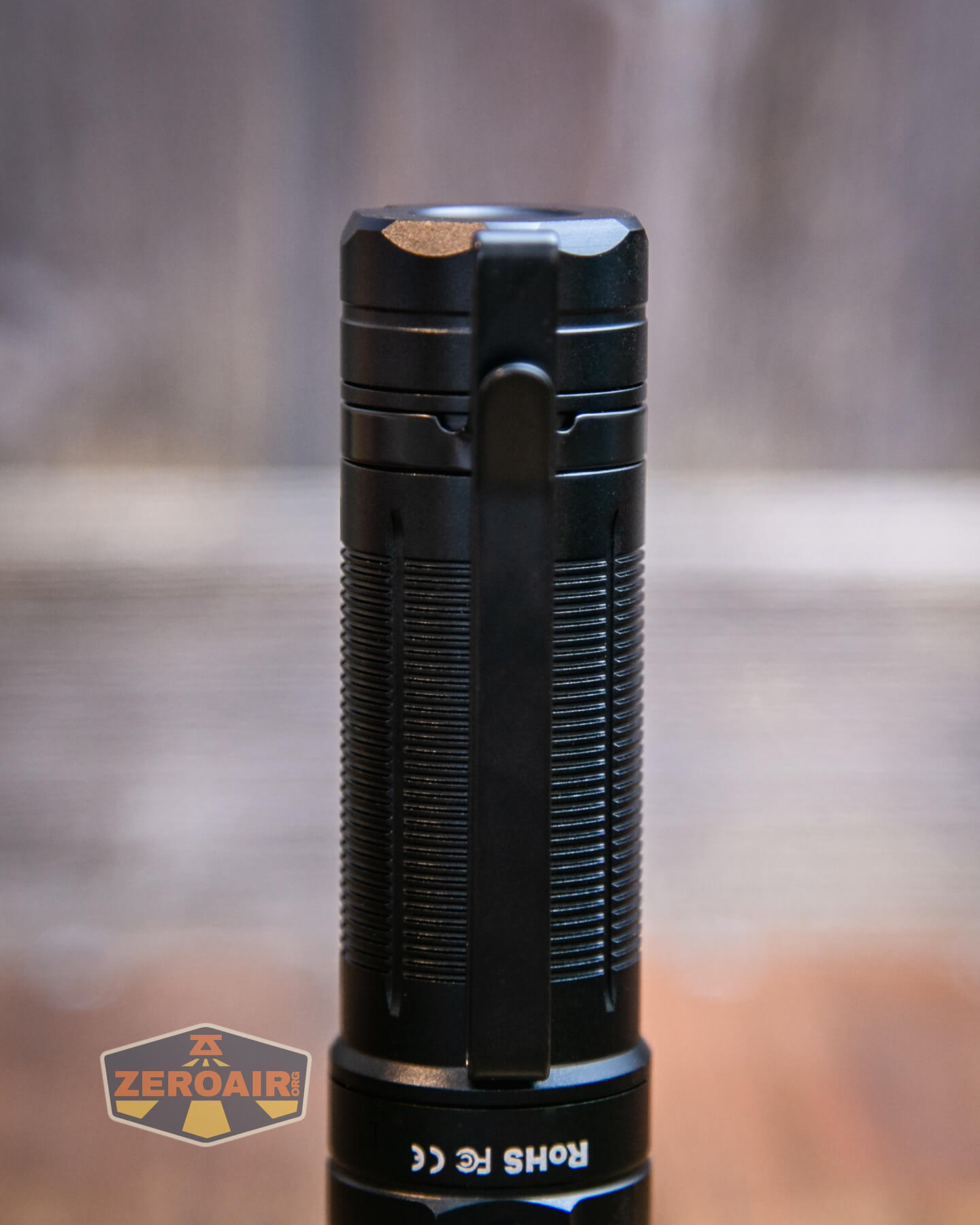 Included (and installed) is a two-way deep carry friction fit pocket clip. The clip is not reversible and can only go on the tail, but again, it’s a two-way clip. Bezel down the light is flush with the pocket. Bezel up, there’s around 1.5″ out of the pocket. (To wit, there’s no good reason to bother with a two-way clip here, since so much will stick out of the pocket in a bezel-up carry.)