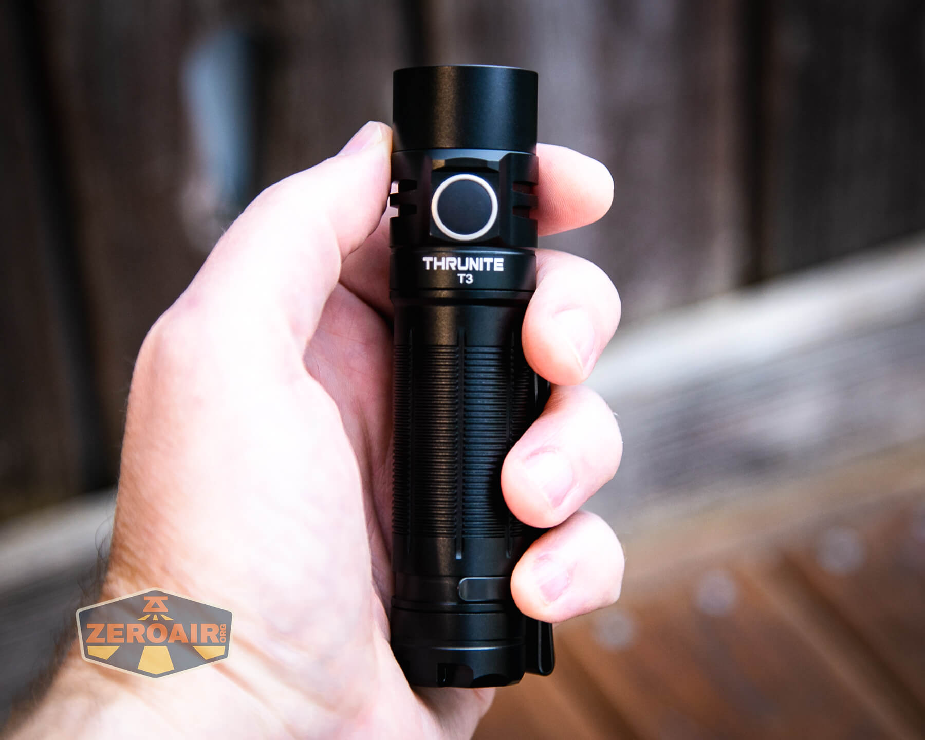 The body doesn’t have knurling but has ridges that provide grip. I believe this also adds to the overall higher build quality feel of the Thrunite T3 thrower flashlight.