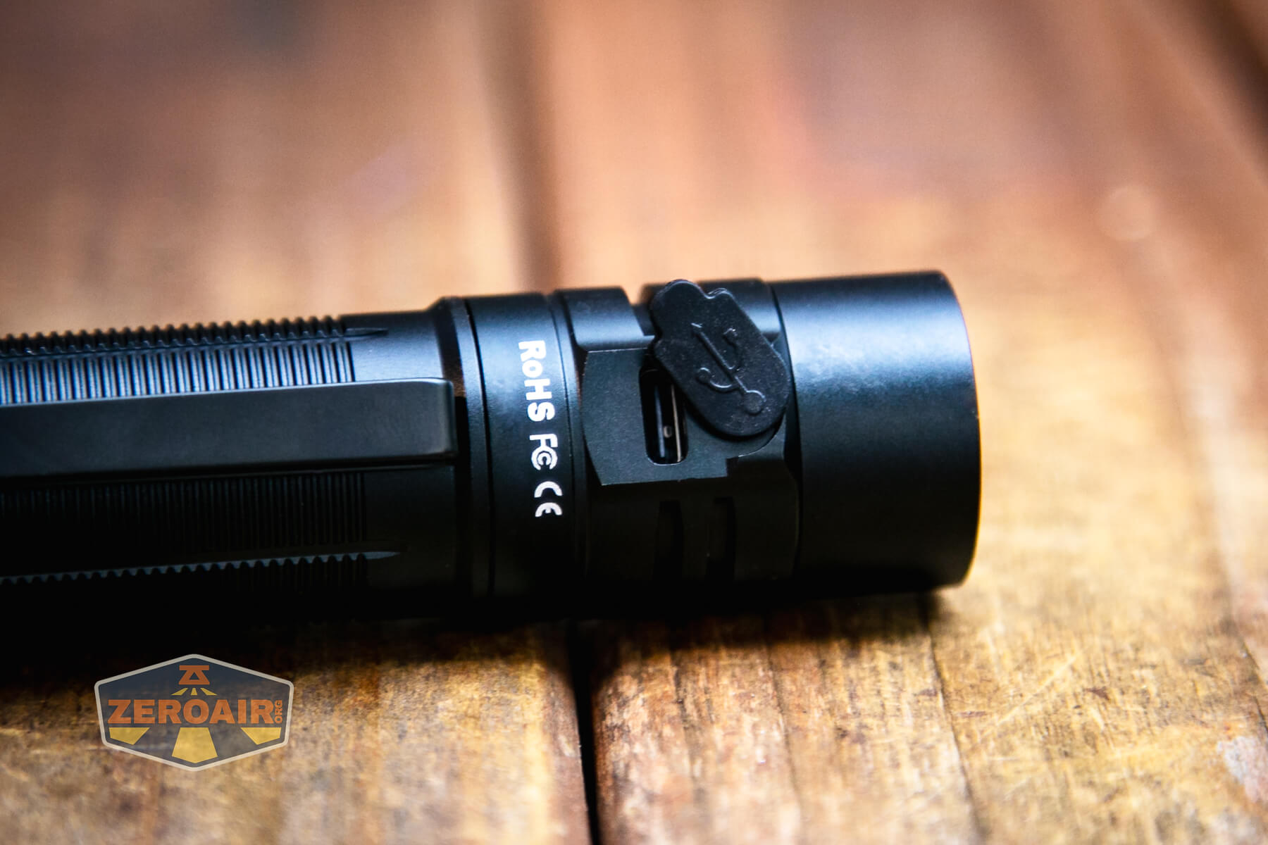 Also built into the Thrunite T3 thrower flashlight is USB-C charging. The port is in the head (opposite the switch) and has a press-in rubber cover (there is a spare). This is a high-quality port – something I don’t say all that often because it’s not always so evident. The port lines up perfectly with the opening.