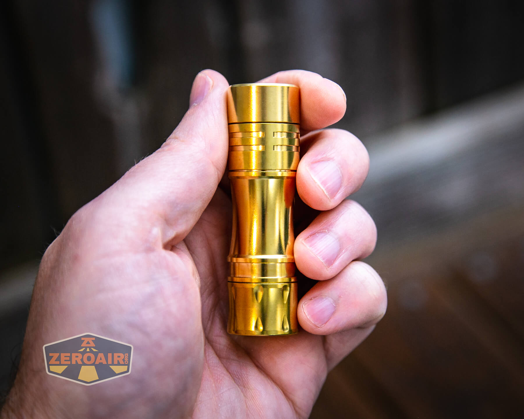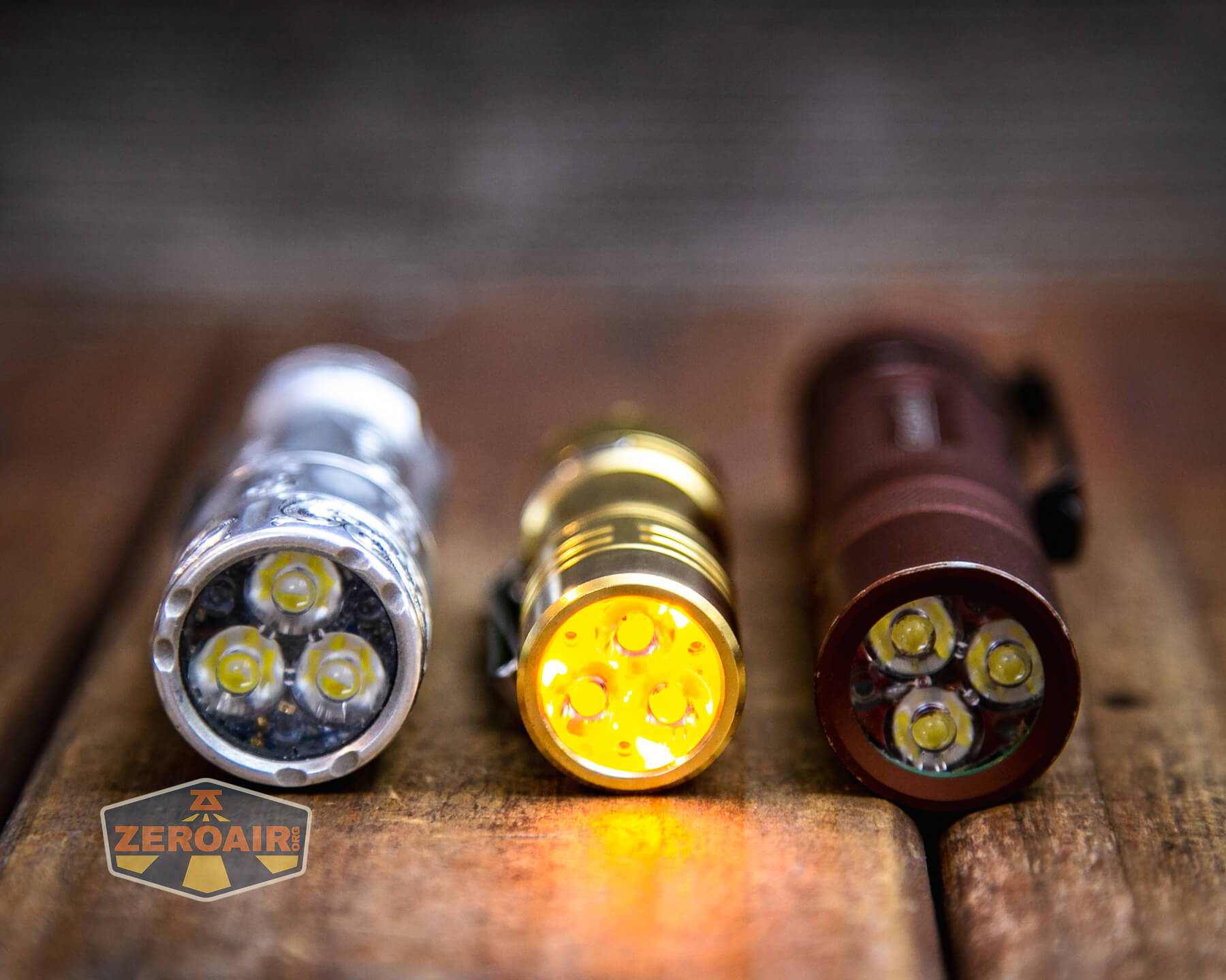 There are many versions of the TS10 – namely in aluminum. In this brass option, there are secondary color options: red, ice blue, and orange (seen here). The light can be purchased with or without a 14500 cell, too.