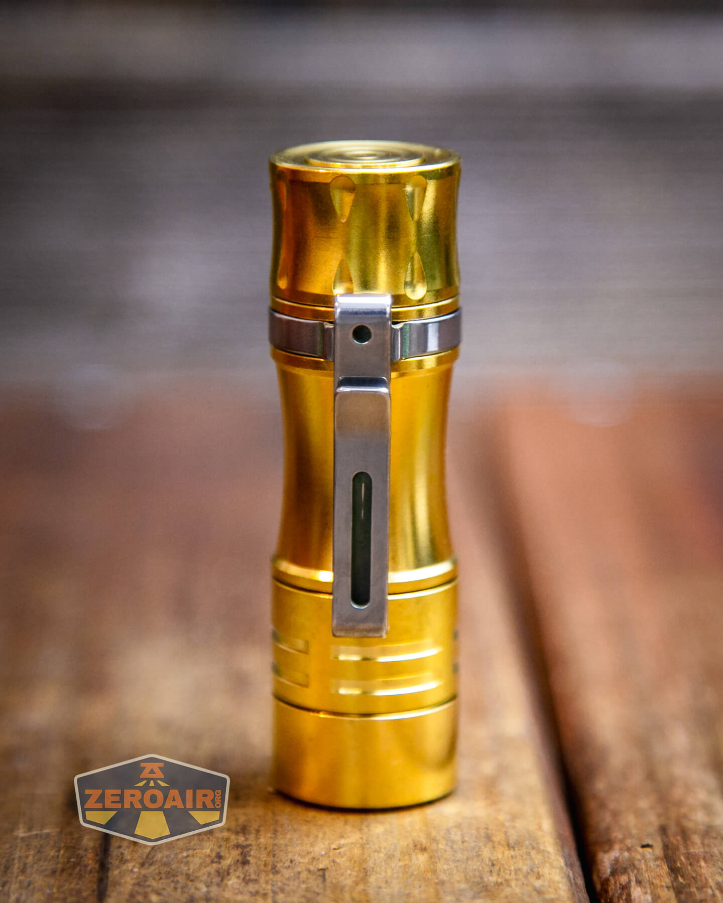The Wurkkos TS10 brass flashlight uses a two-way pocket clip. This clip has a couple of options for lanyard attachment, including a hole in the shoulder, and a long slit down the side.