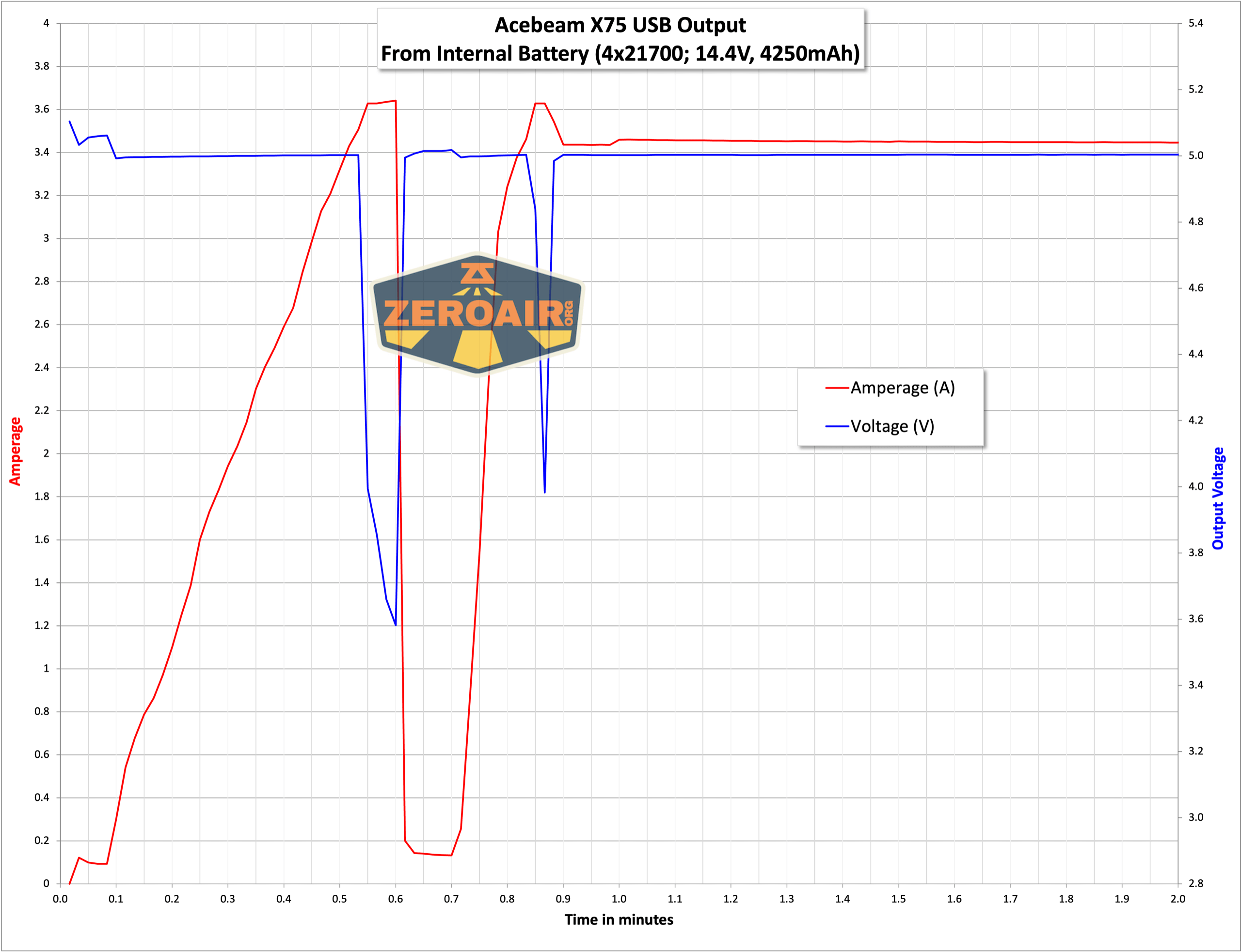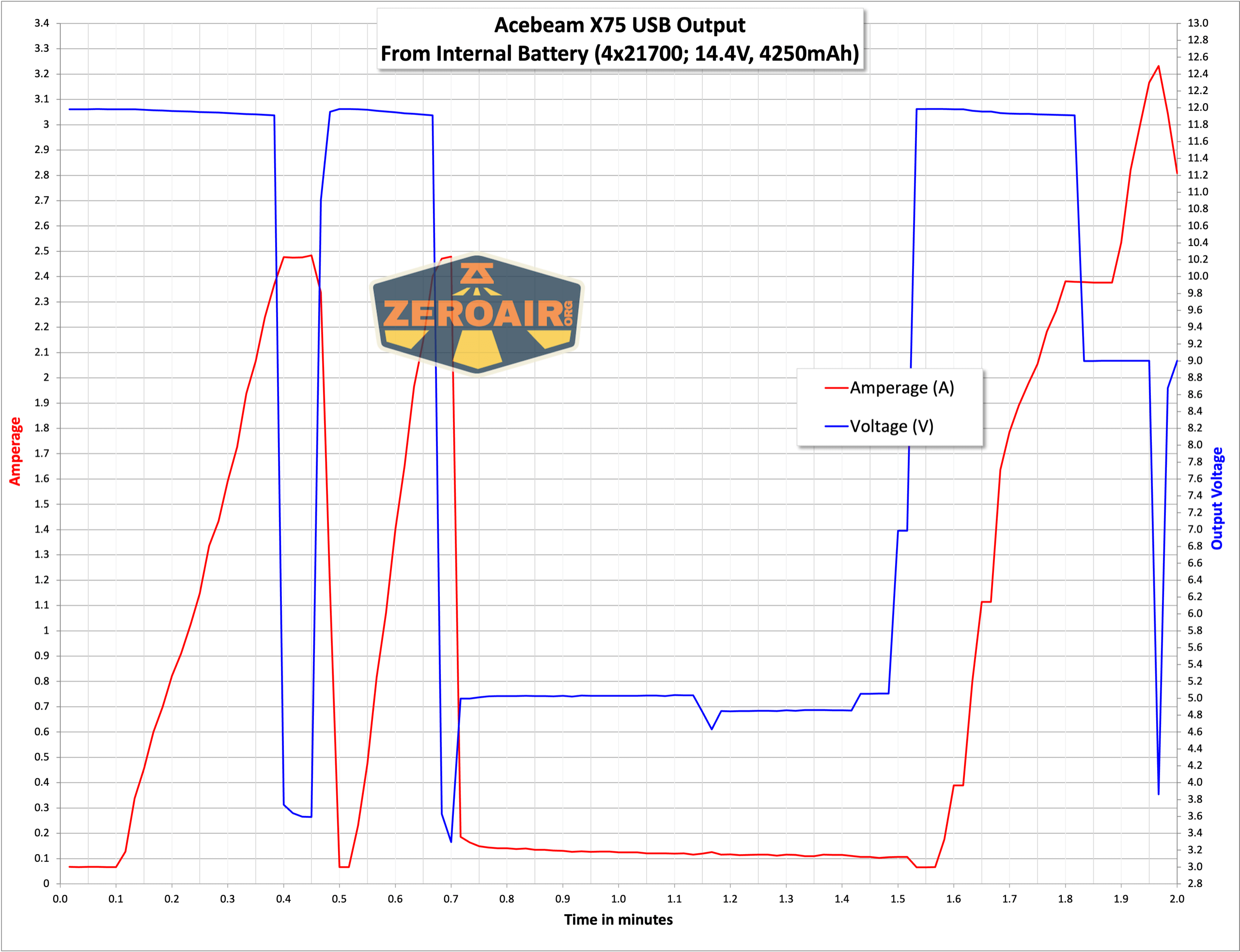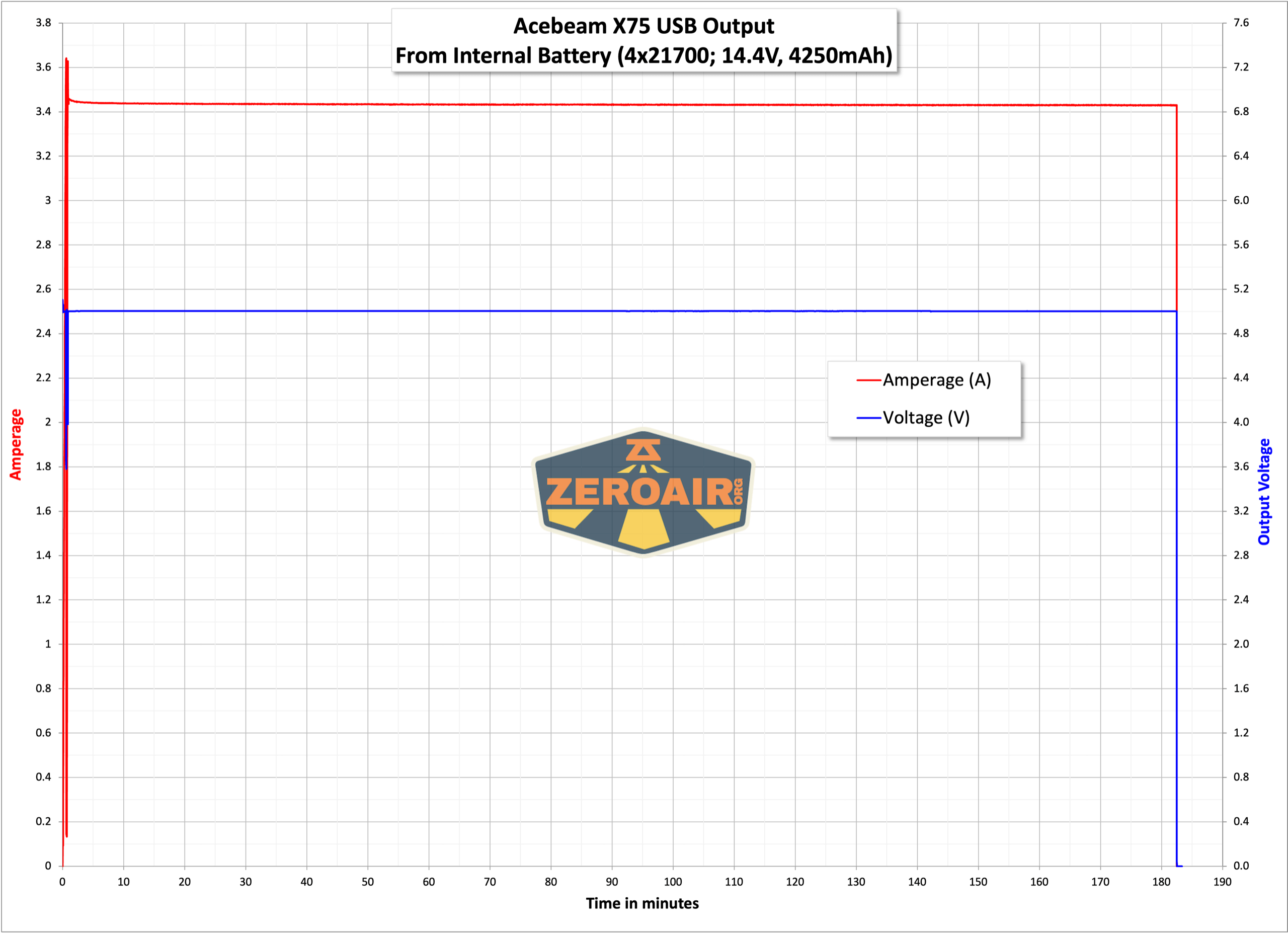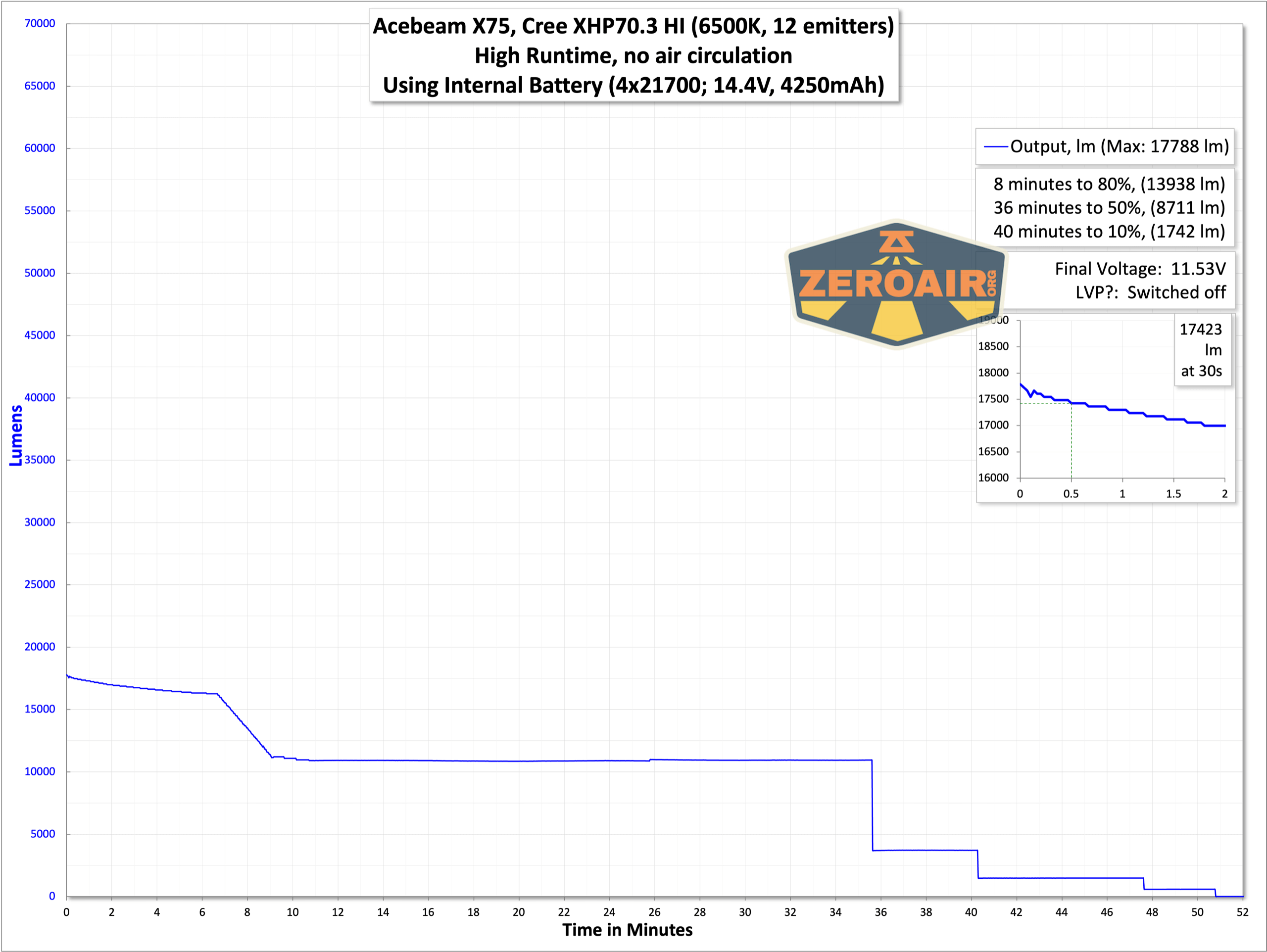 Here are a number of runtime graphs. I tested the Acebeam X75 brightest powerbank flashlight in “Eco” mode – note that total output for each is the same, but the stepdowns (and thus runtimes) are a bit different.