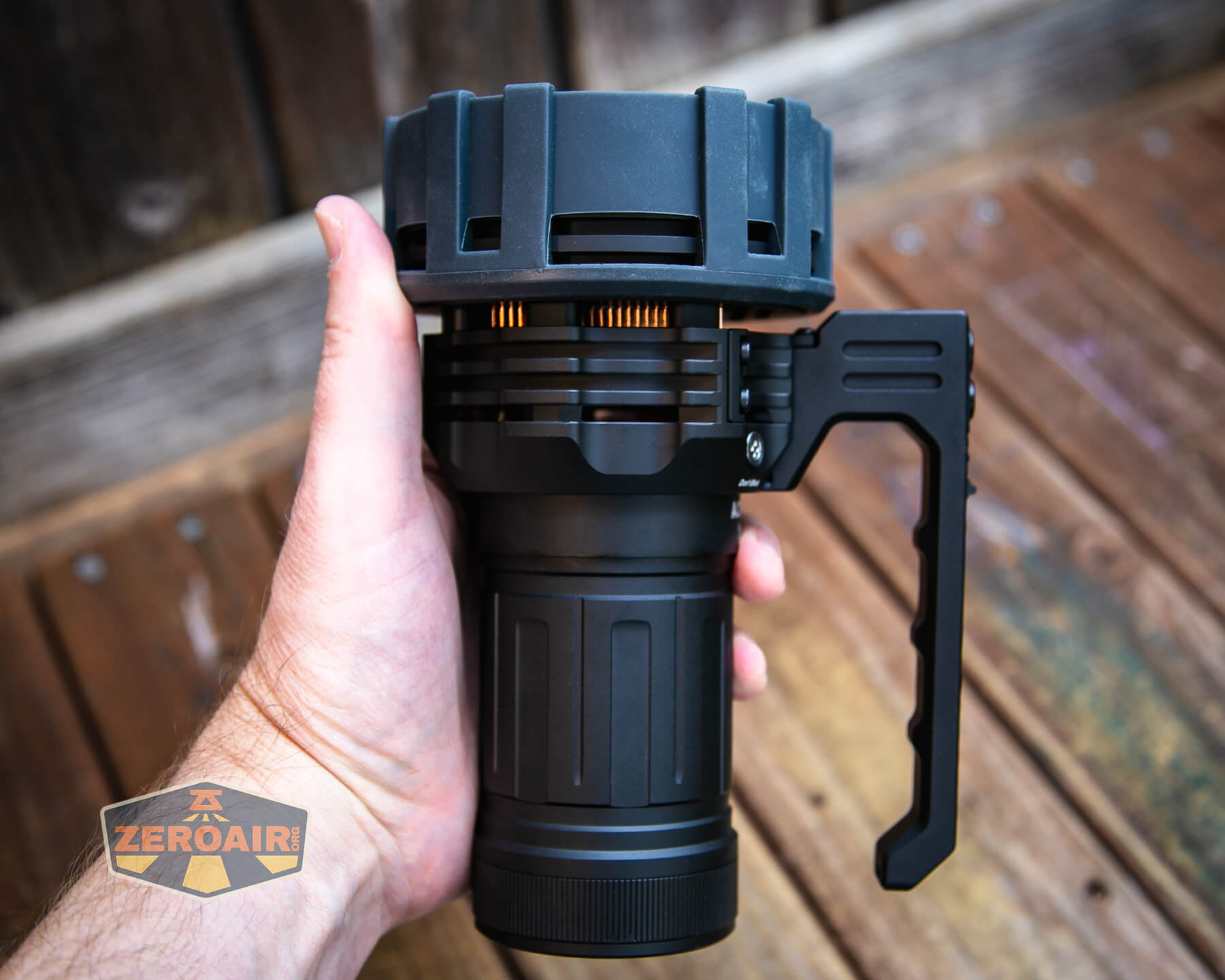 The Acebeam X75 brightest powerbank flashlight has two means of retention. First is the handle, which more importantly has the switches for controlling the output and fan.
