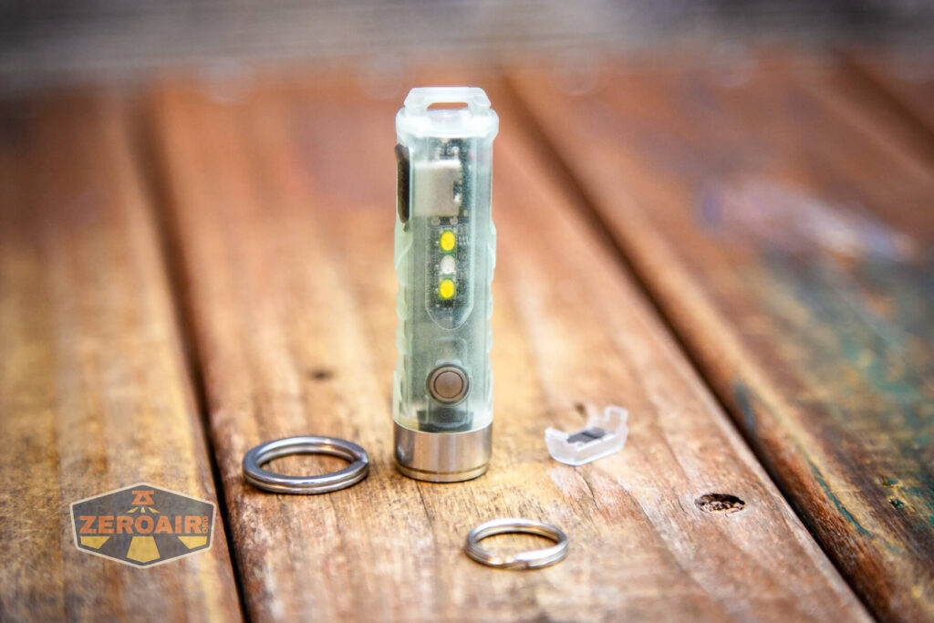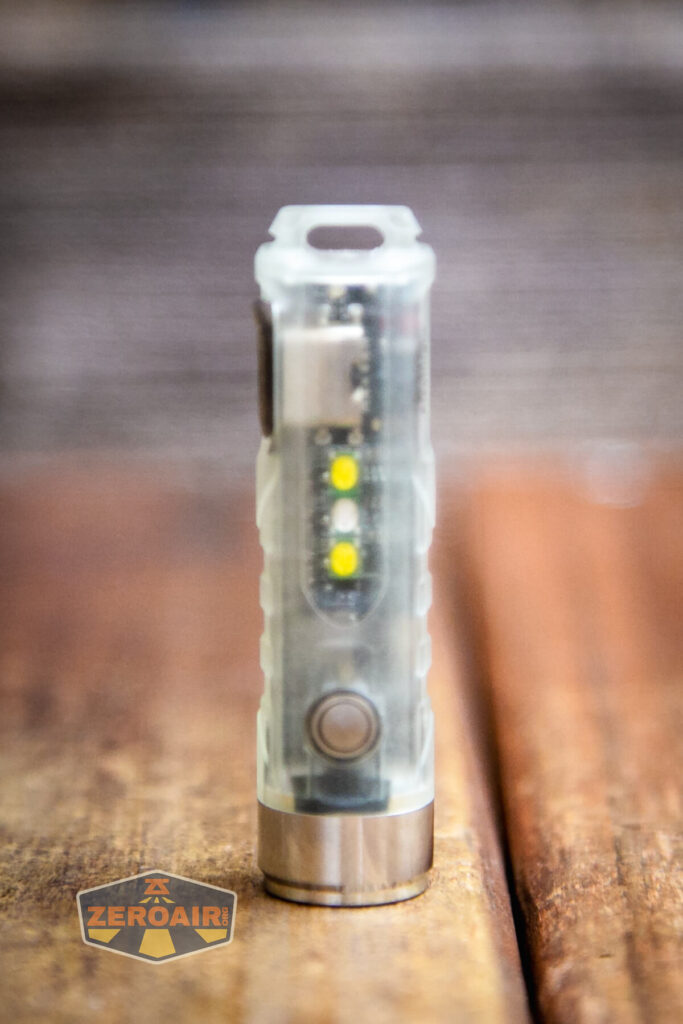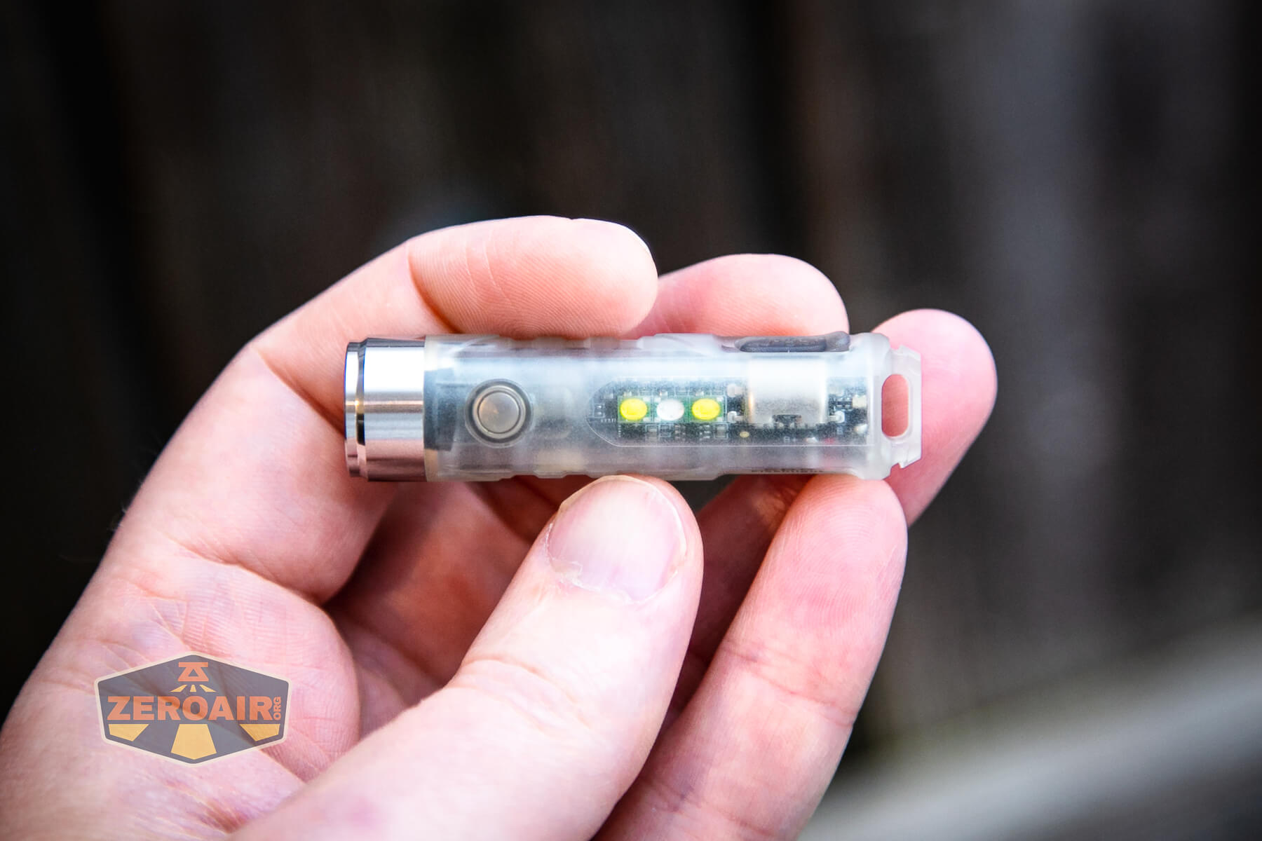 The RovyVon Aurora A5 keychain flashlight is nicely built. The body is fully plastic aside from the bezel, which appears to be stainless steel.