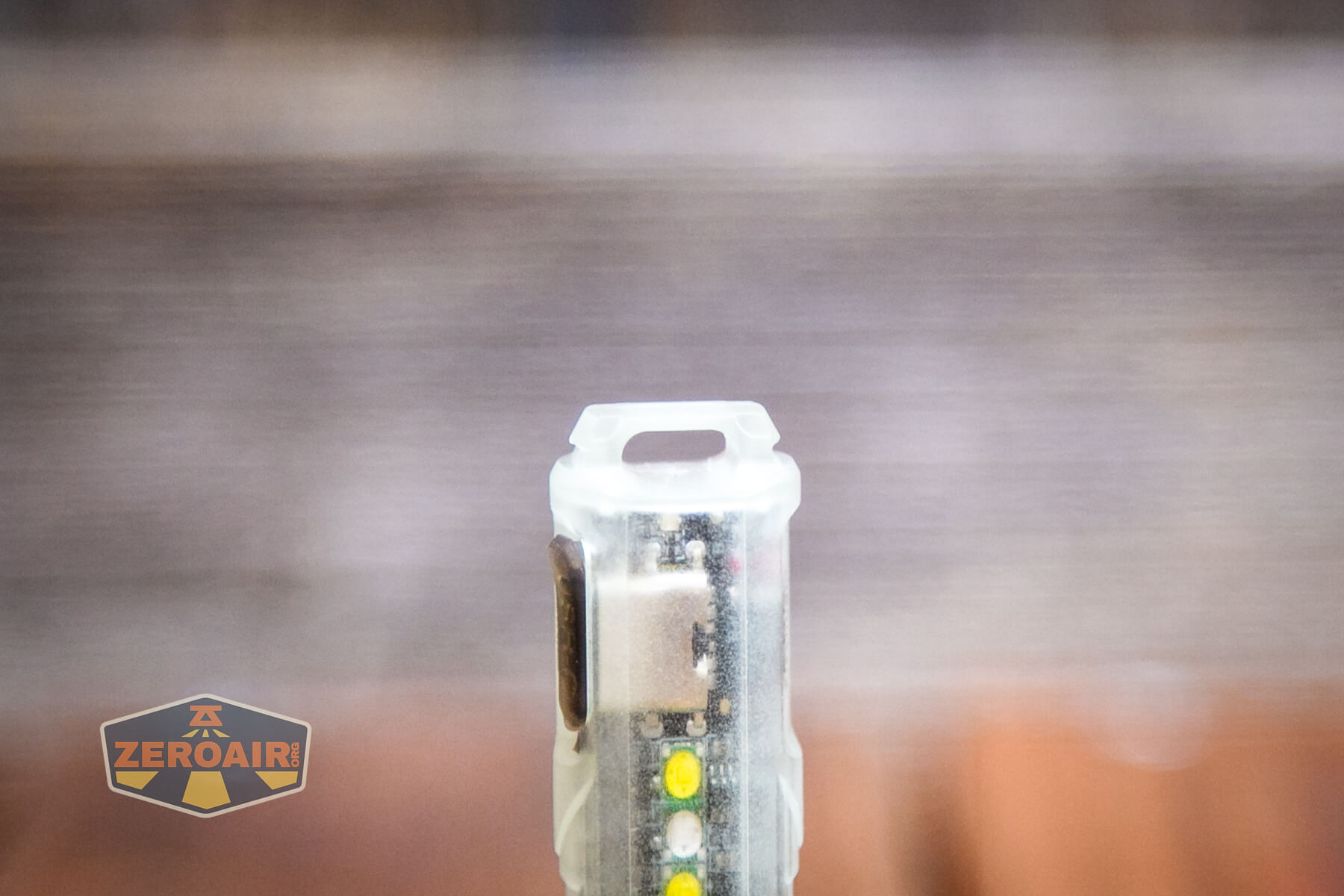 The RovyVon Aurora A5 keychain flashlight is charged via USB-C, which has a push-in rubber cover. This cover stays attached. The plug is a little harder to manipulate than most I’ve used, but it works just fine.