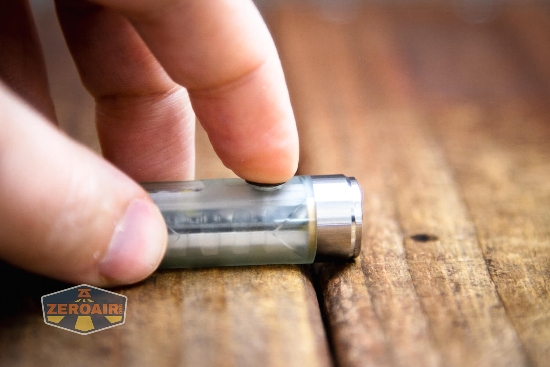 There’s a single side switch for operating the RovyVon Aurora A5 keychain flashlight. It’s a clicky e-switch.