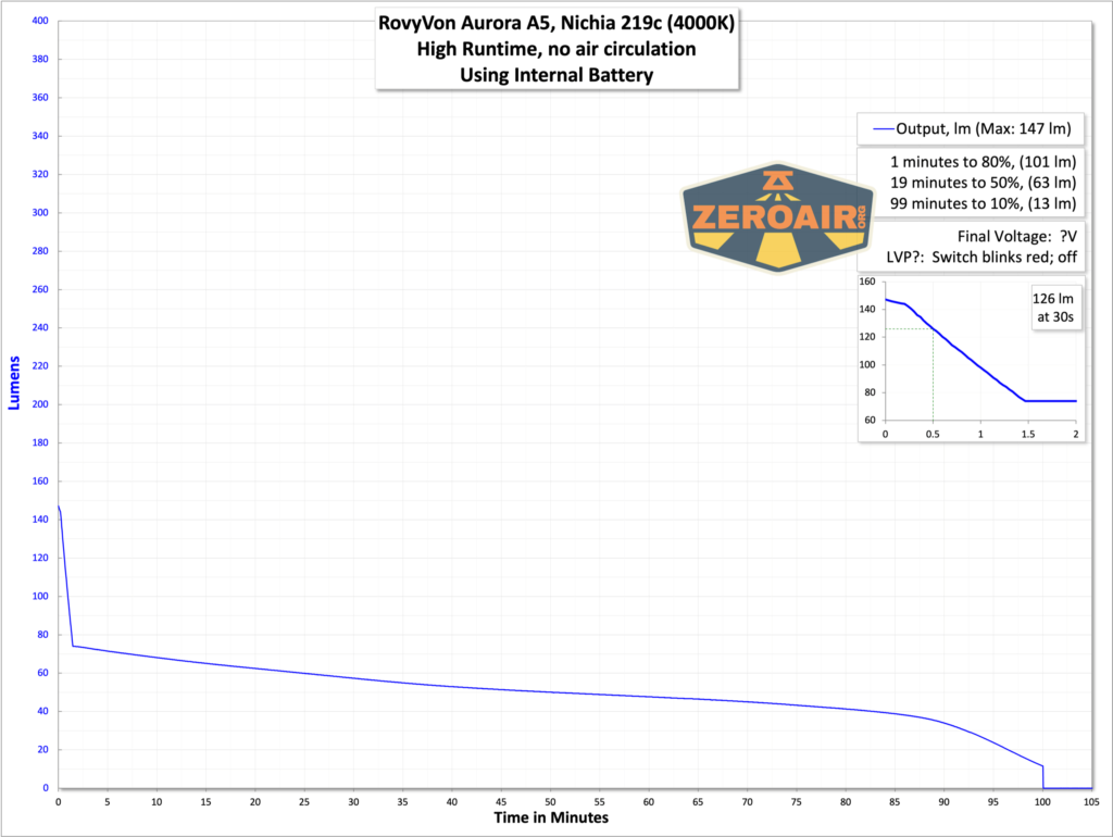 The light shuts off when the cell voltage is low, but I’m not able to test at what voltage it shuts off. RovyVon has confirmed that the shutoff voltage is 2.8V.