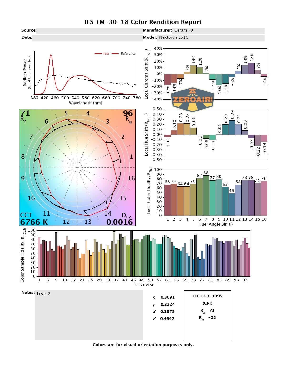 The order is as used with the mode order of light: High to low. CCT is very cool, at over 7000K for high, and dipping to only around 6500K for the lowest level. CRI is low, at around 70.