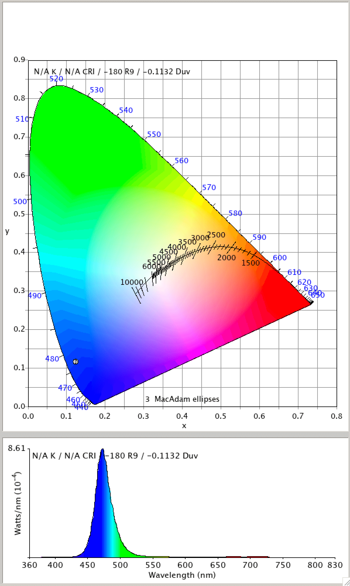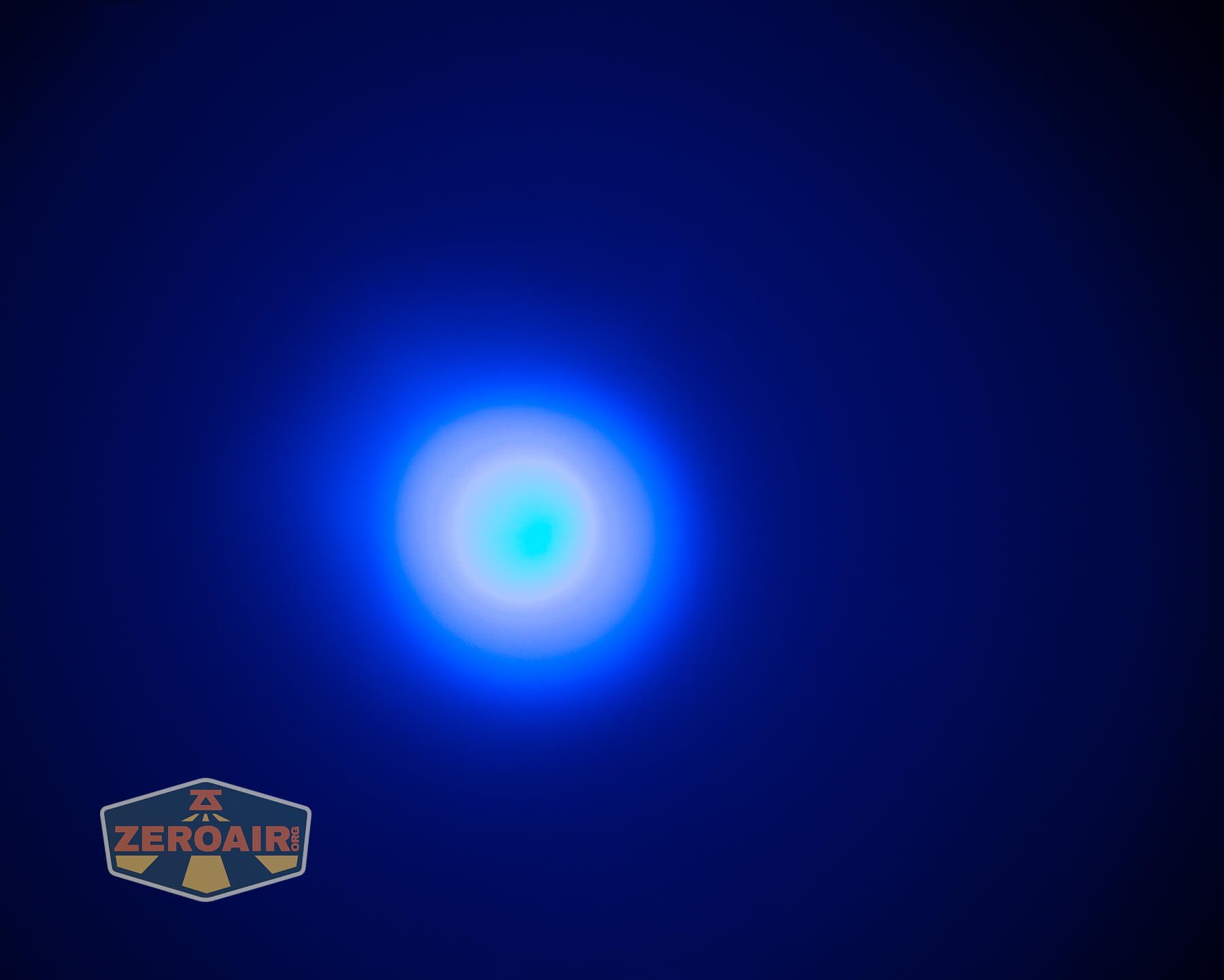Despite the claims of 5000-6000K for these emitters, I’m reading a bit cooler on the flood emitters (5700K-6200K) and much cooler on the throw emitter (6400K-7600K). For the throw emitter, I added one extra test. The fringe of the throw beam has a bit of aberration, and that is actually quite a bit warmer, at around 4500K. It’s a small area, though, and not “warm in the good way” type of warm.