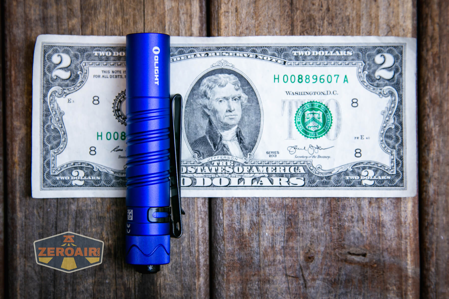 The Olight i5R EOS HCRI flashlight is 95.4mm long and 17.8mm in diameter. The weight is 60g.