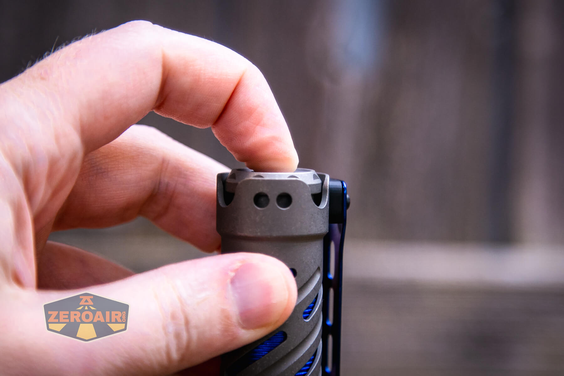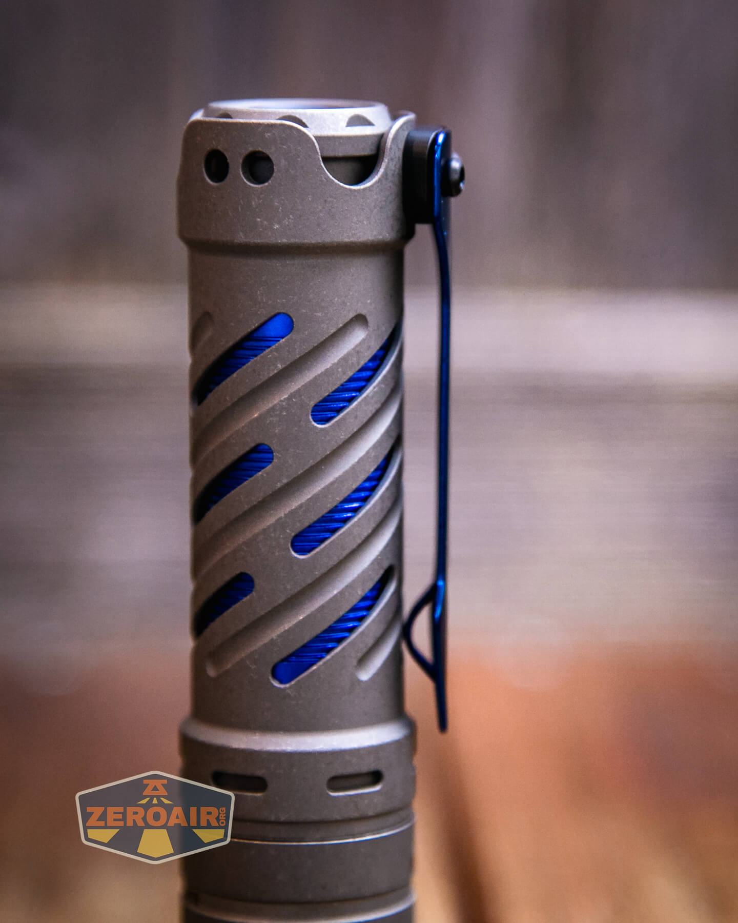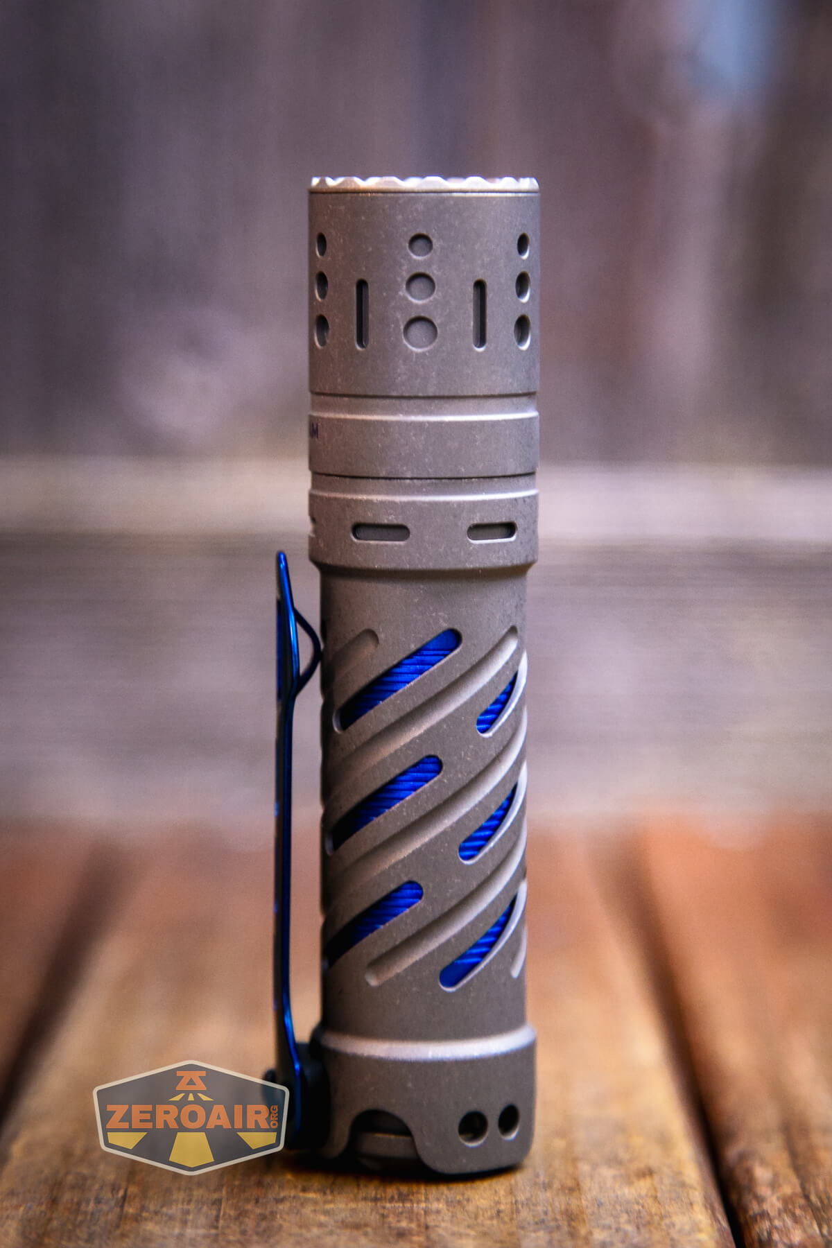 First of all, how much stuff is going on here with this light? There are body spirals. More than just spirals – there’s an inset body, with blue anodization. There are tritium slots in the shoulder. There are cooling…. circles… in the head. It’s a lot to take in! I’m happy with the size of this light. Generally, because I’d say I’m happy with the size of the 21700 cell lights. But this is an 18650 cell light…. What I mean by that is that it’s “probably big” for an 18650 light, but the size isn’t off-putting (You should be off pudding!), because the size is still acceptable. But look at the size comparisons below to make up your mind. (It’s shorter than a Convoy S2+, and everyone should have many of those!)