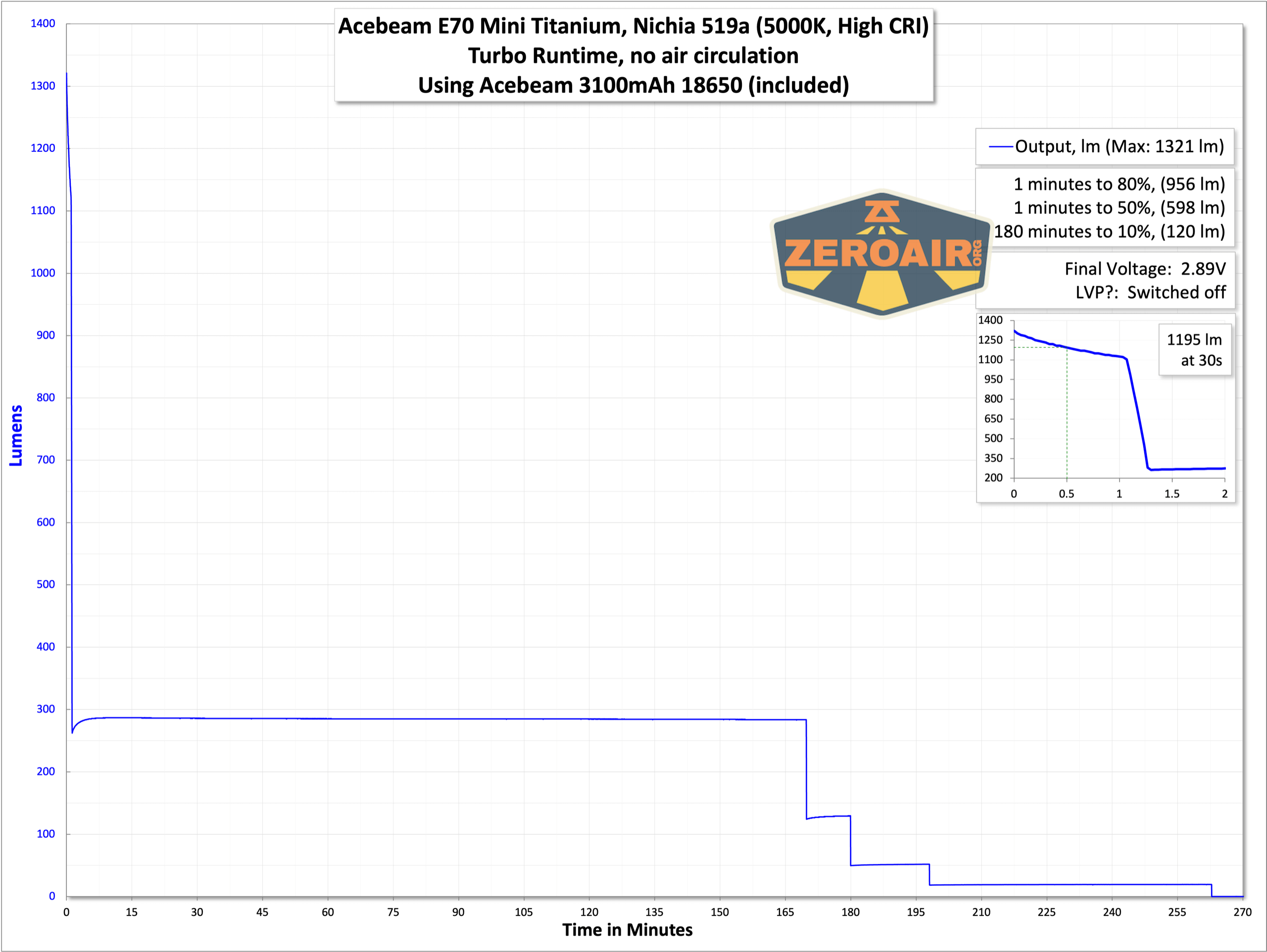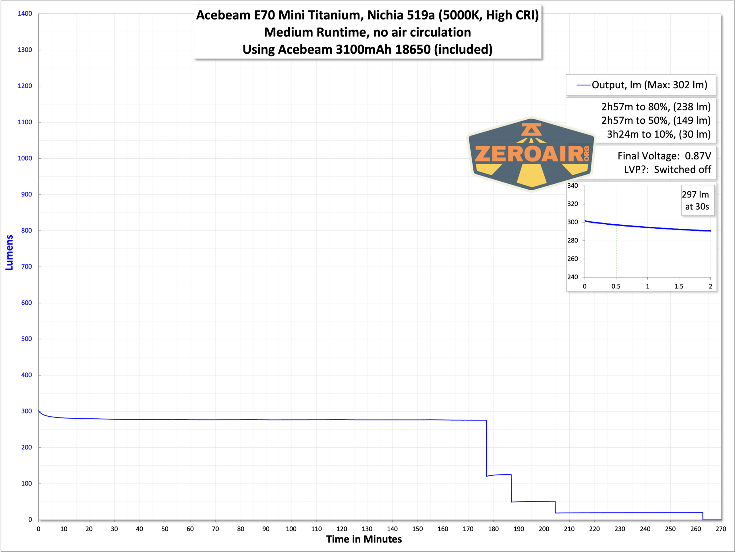 Below are three runtime graphs. The output looks pretty good but does step down quickly. After the stepdown, the Acebeam E70 Mini maintains >400 lumens for over an hour and a half.