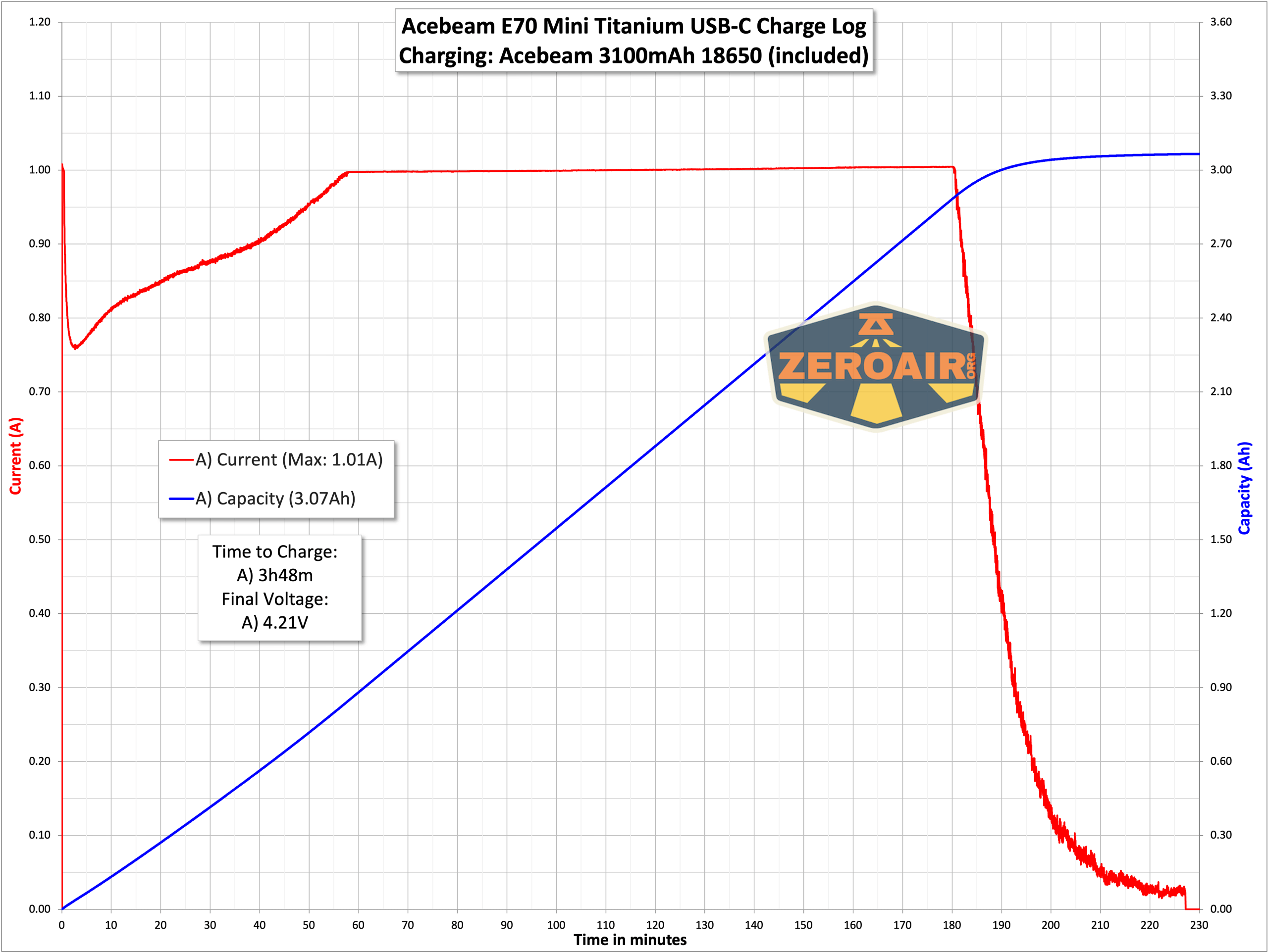 Both USB and USB-C power can charge the cell. The profile is about the same for either and requires around 3 hours to complete.
