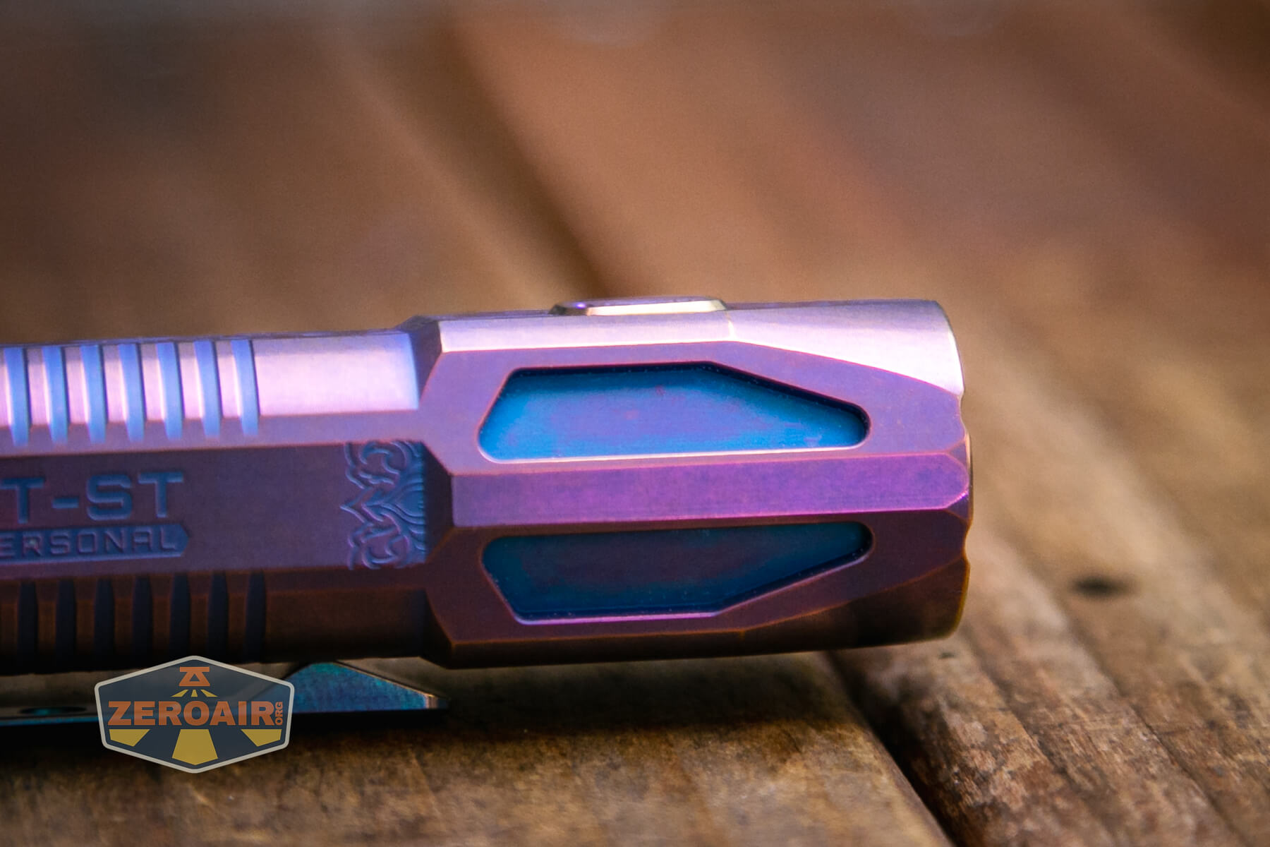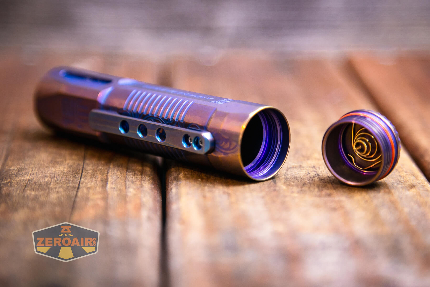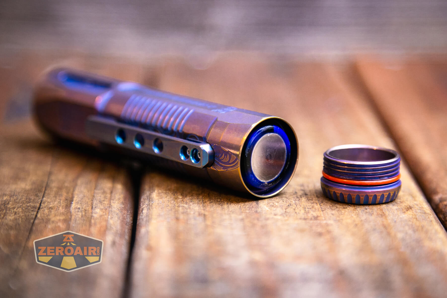 Now functionally the tailcap is fine. It’s easy to unscrew and the threads are fantastic (especially for titanium). But there’s no way whatsoever to remove and reinstall the tailcap without touching the threads. That’s not a problem except that the threads should be (and are) lubed. So you end up with thread lube on your fingers. And if you’re like me, that will end up in your eyes (it can not be avoided, and I’m a professional at avoiding things. It can not be avoided.) So while this tailcap setup helps with the overall look of the light, it’s quite annoying that you end up touching the threads when swapping cells.