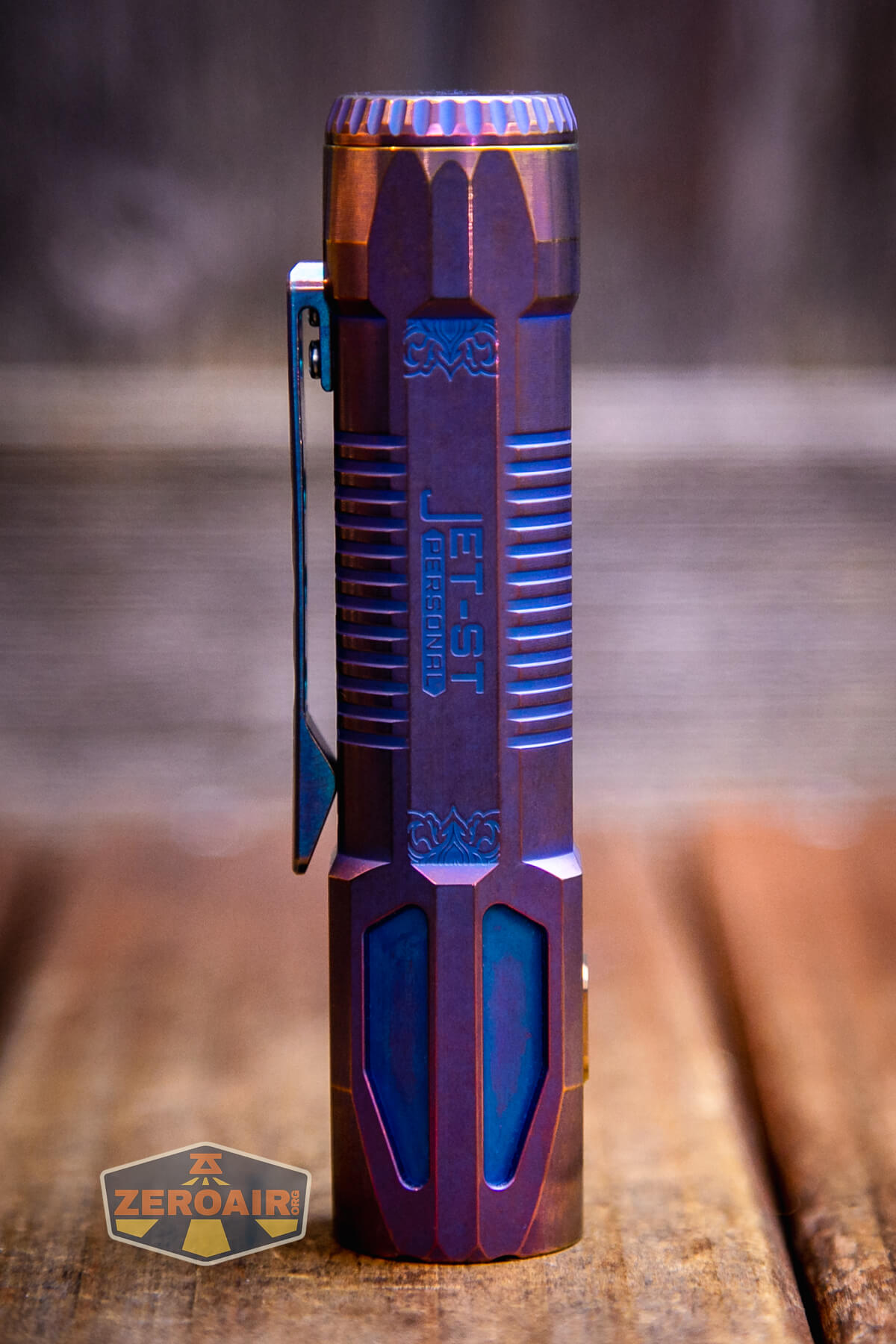 Here’s the JETBeam Jet-ST Personal, a flashlight I have chased for ages. This titanium light using one 18650 has an e-switch and a great look!