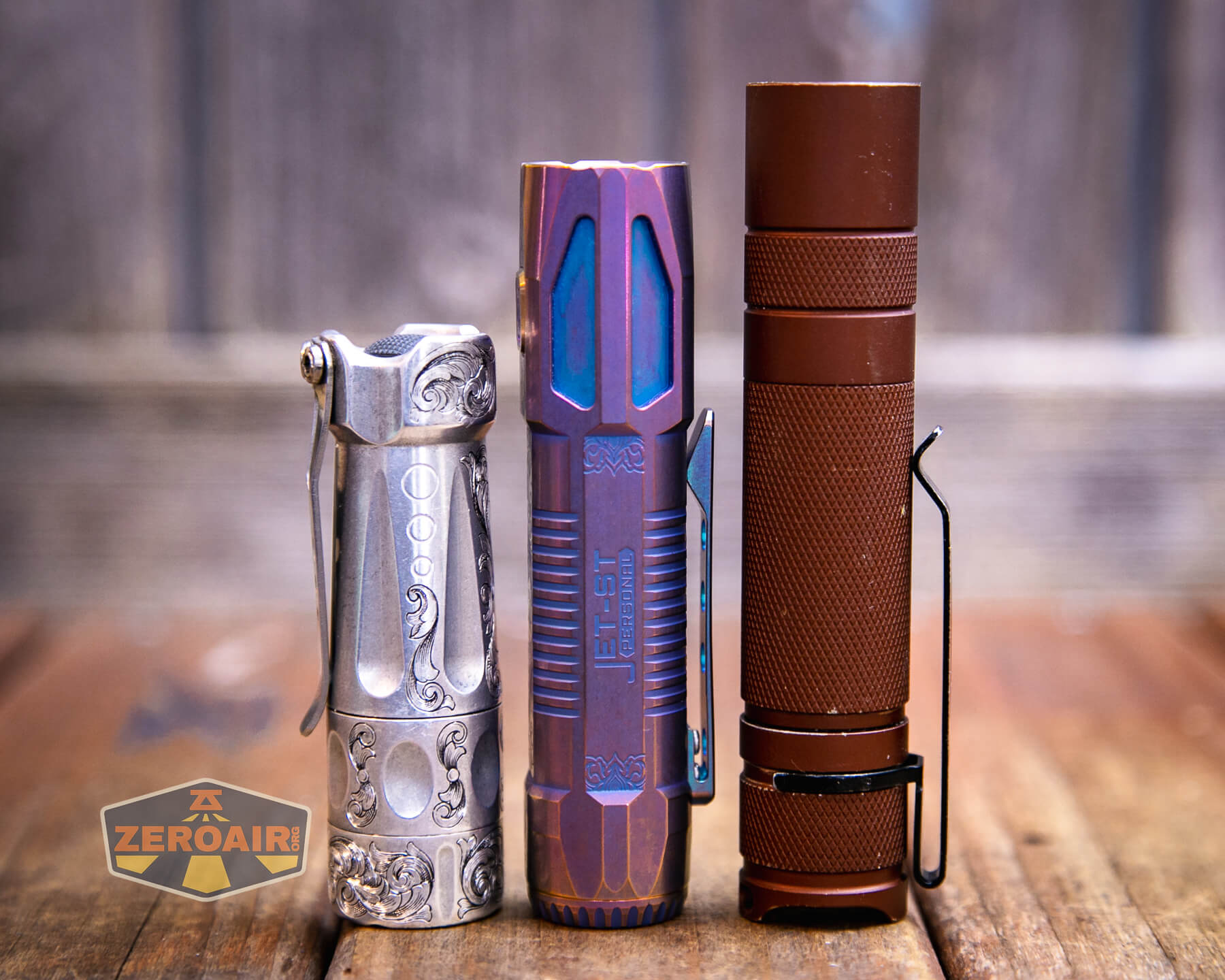 Below is the JETBeam Jet-ST Personal flashlight with another of JETBeam’s anodized titanium flashlights.  This is the Jet-II Pro, and I’ve got a technical review of the aluminum version and a bunch of photos of this titanium version.