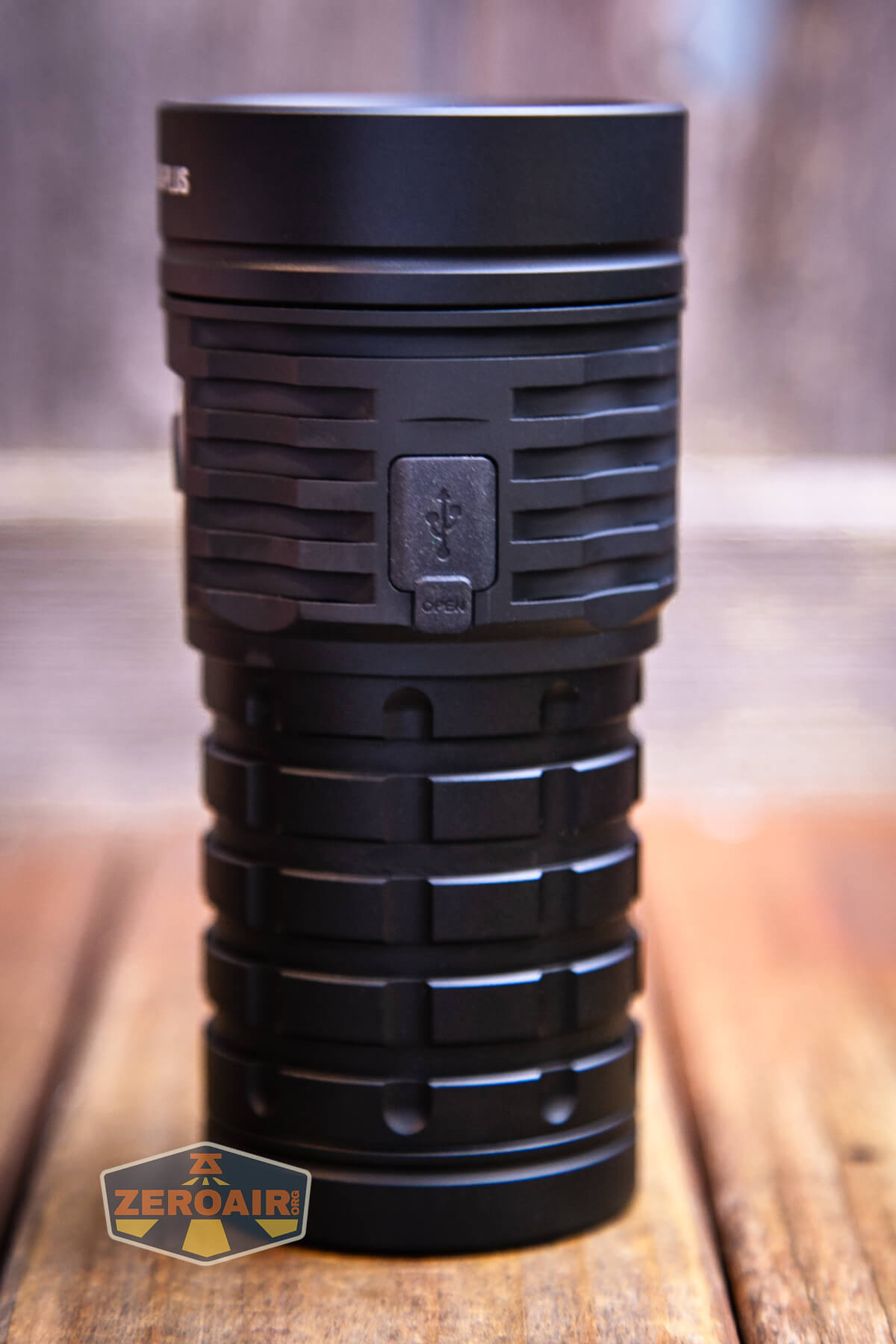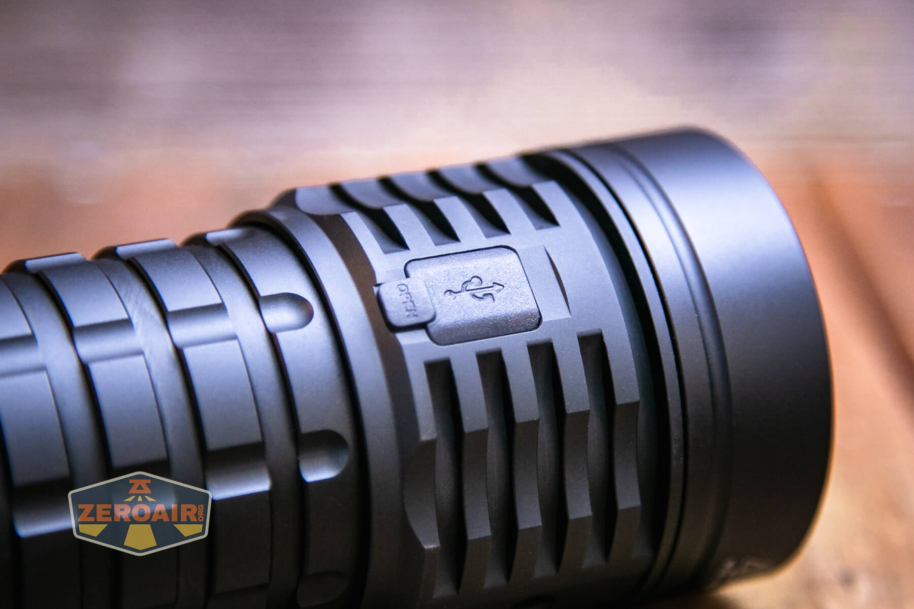 The Sofirn Q8 Plus flashlight has a charge port on the head near the switch. Sofirn used a USB-C charge port, and the cover is a simple press-in silicone cover.