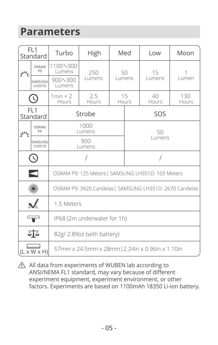 Below are a few runtimes. Wuben seems to have reduced the claimed output for this Samsung version (or just updated the manual, more likely). That’s nice! I’m pleased to see around 1 minute at over 800 lumens. After that, the output (and output on all other modes, too) is extremely stable. Fantastic. The light shuts off when cell voltage gets low, too – around 2.8V or so.