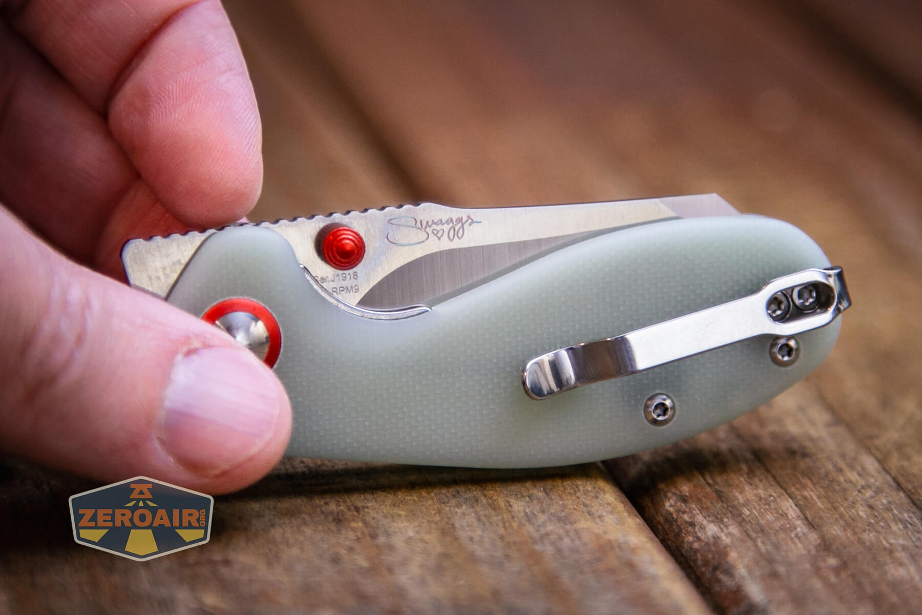 I suppose whether you like the look of the red accents against the green (“Jade”) handles is personal preference. I think it looks great. I would guess this was the design feature choice of Swaggs (the branding namesake shown on one side of the blade.) I don’t know what other role Swaggs played in the development of this knife.