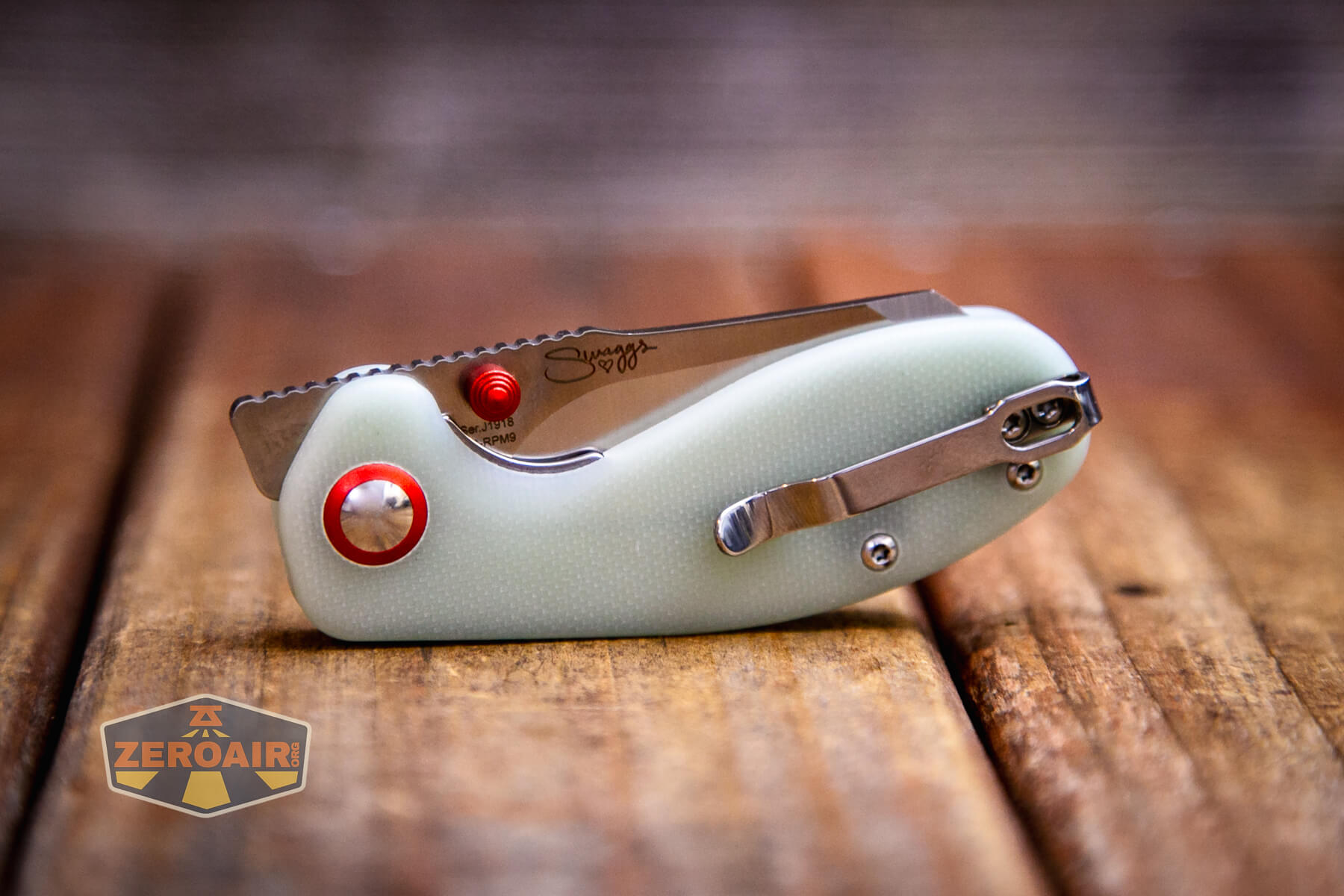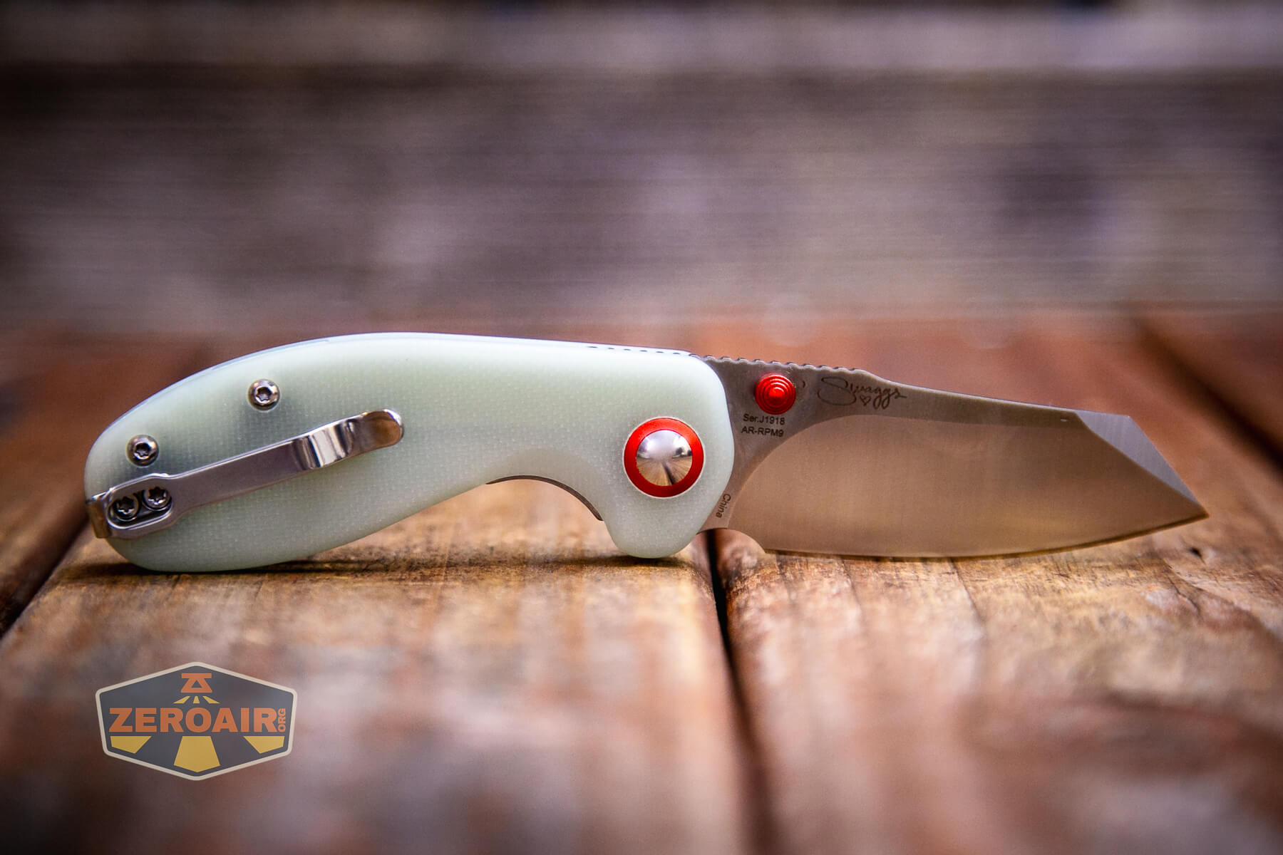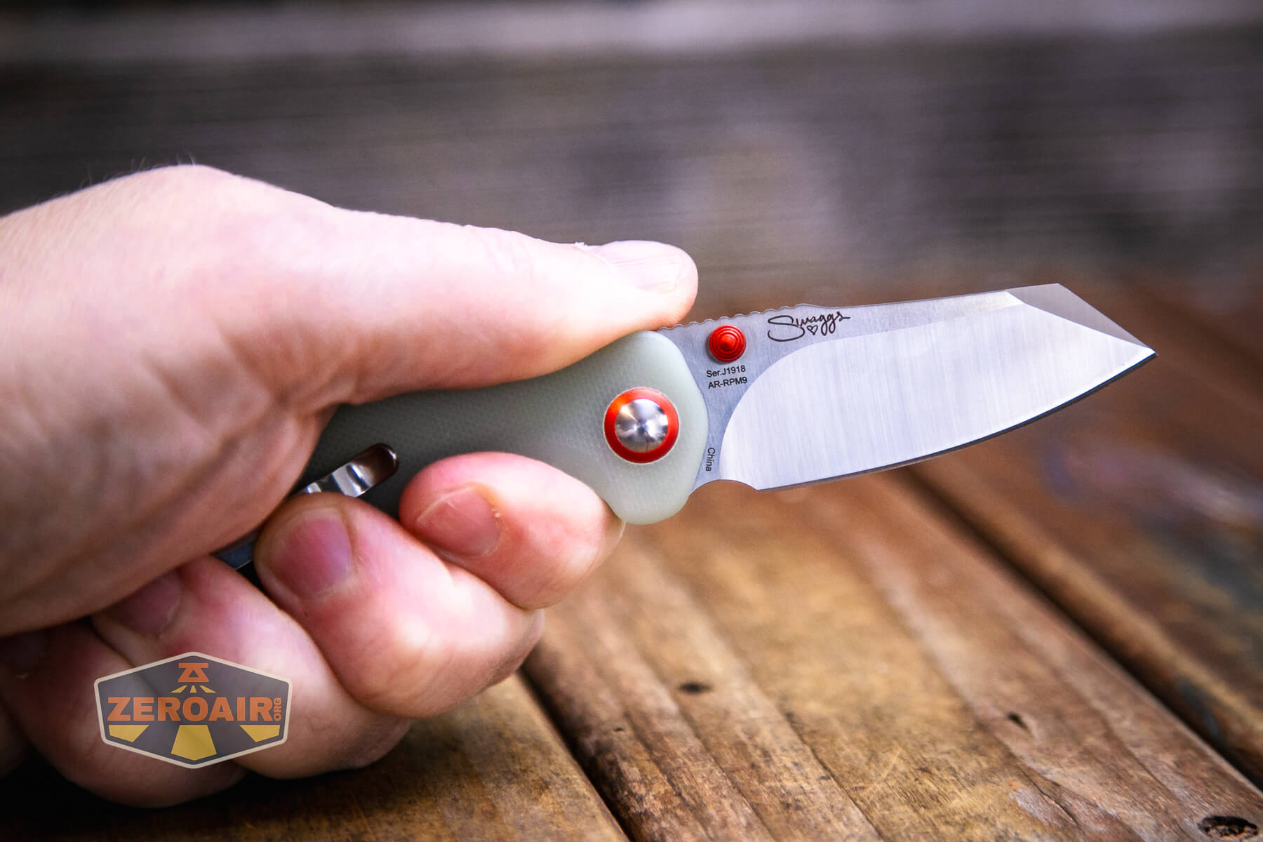 Here’s the CJRB Maileah J1918, a folding knife with AR-RPM9 steel. This knife has Swaggs branding and great natural green G10 scales!
