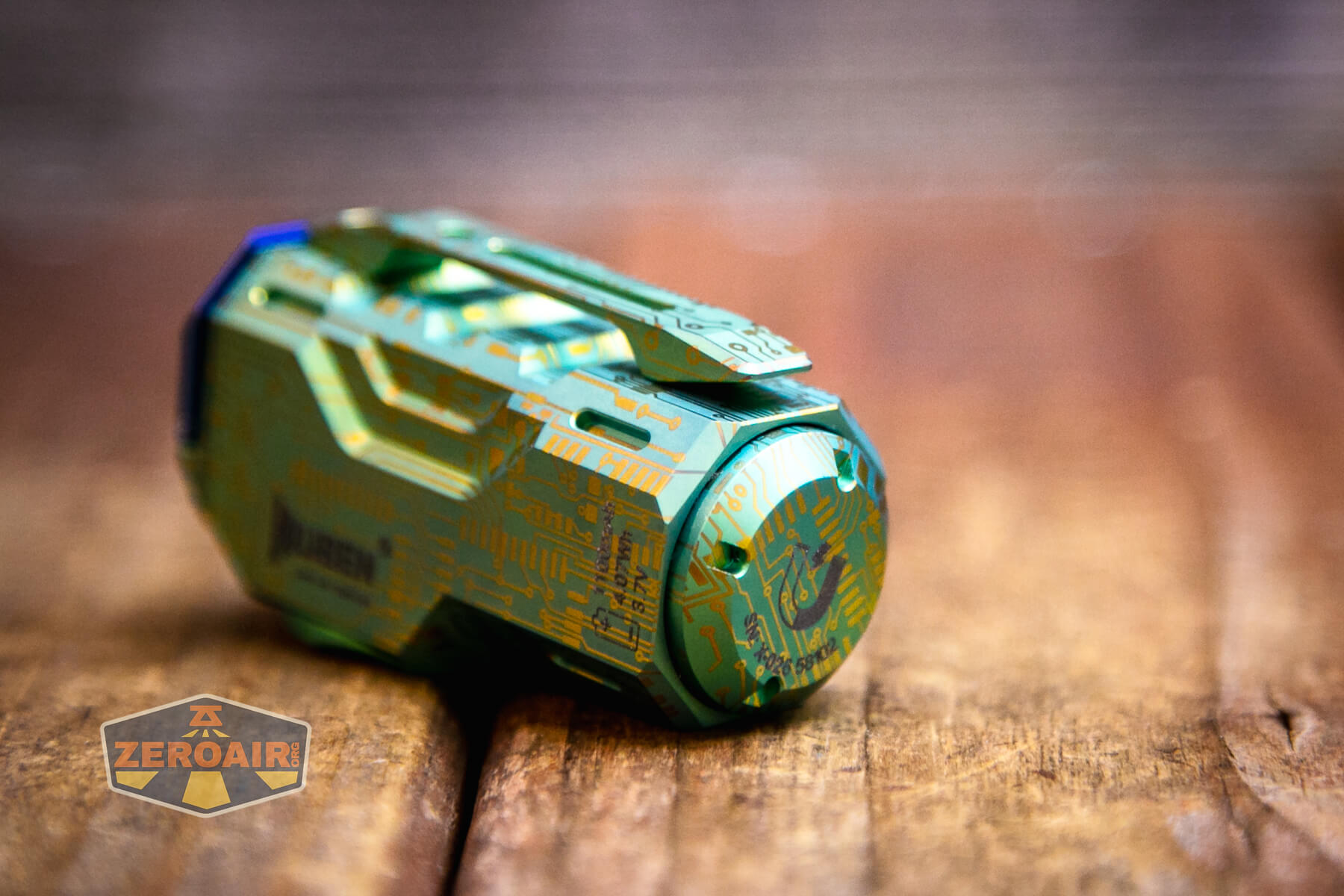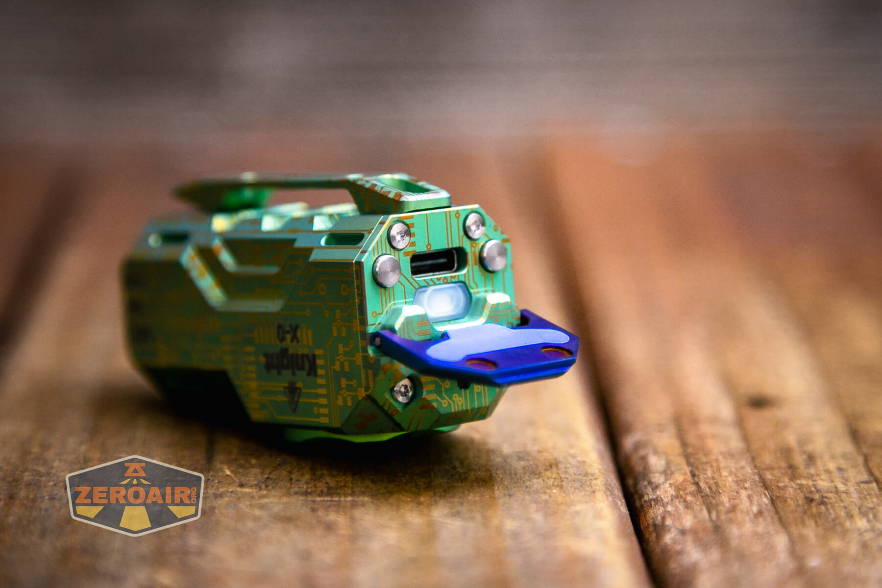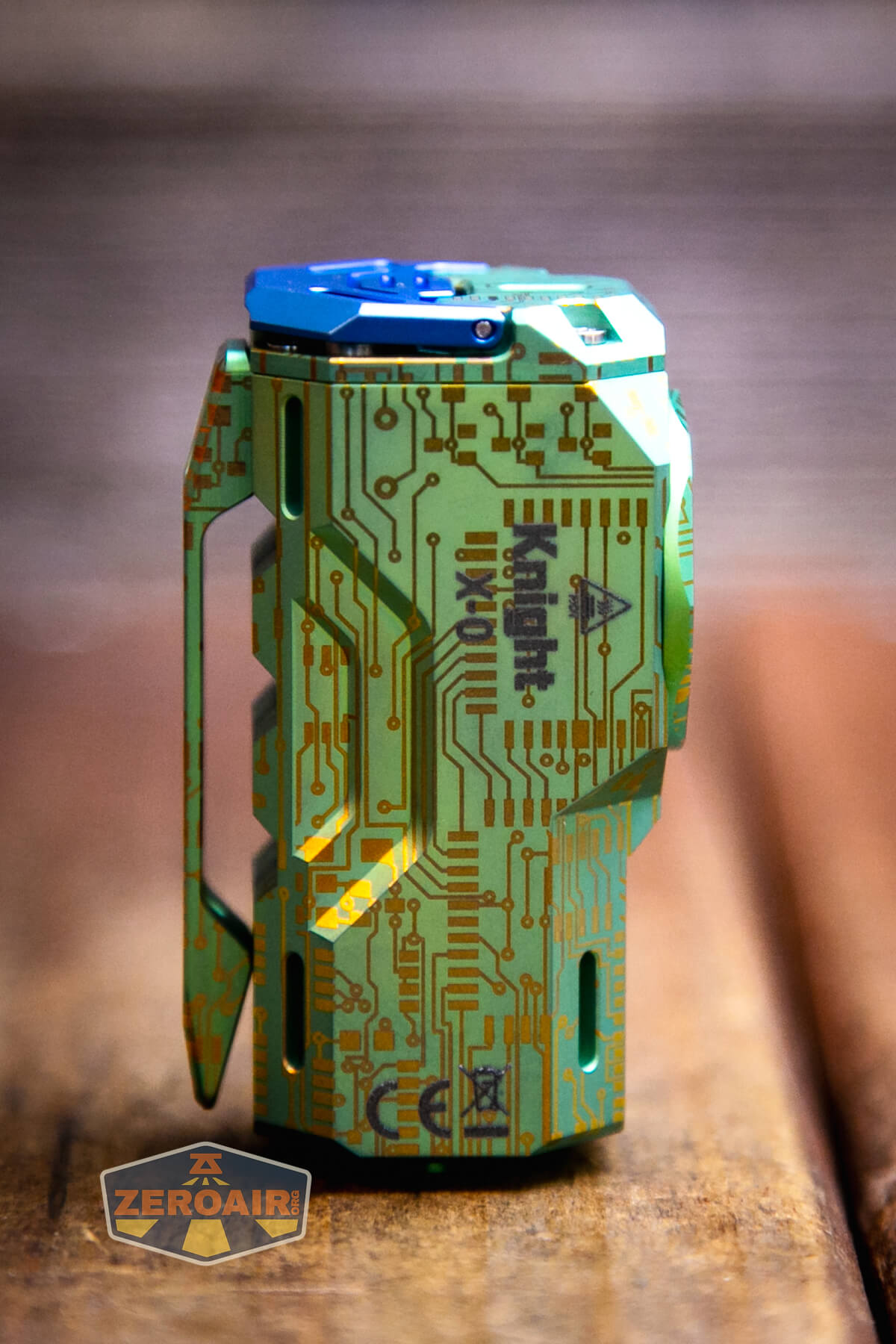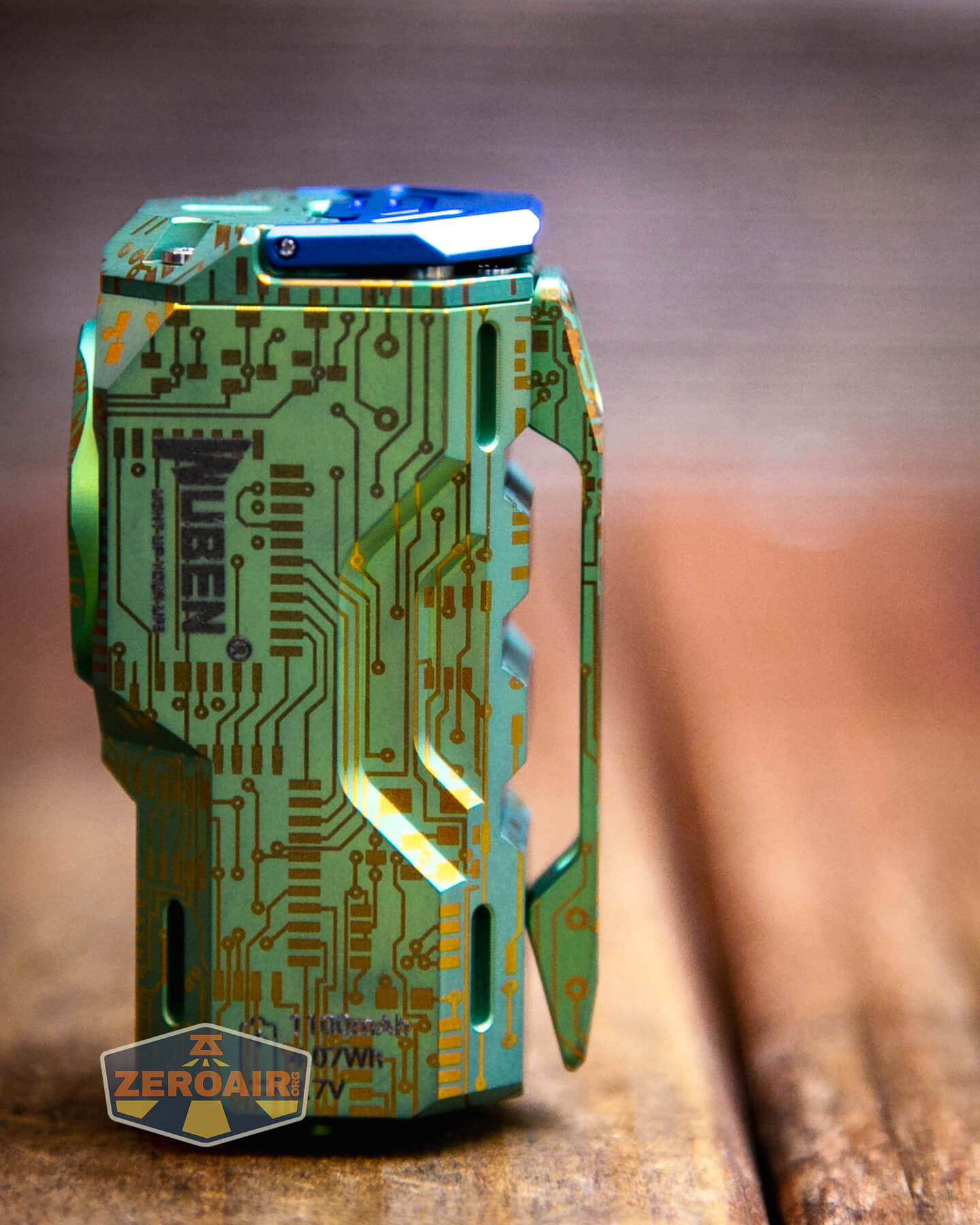 The Wuben X-0 Knight titanium flashlight is now available! It has USB-C charging as well as many Tritium slots and a novel design – engraved blues and greens!