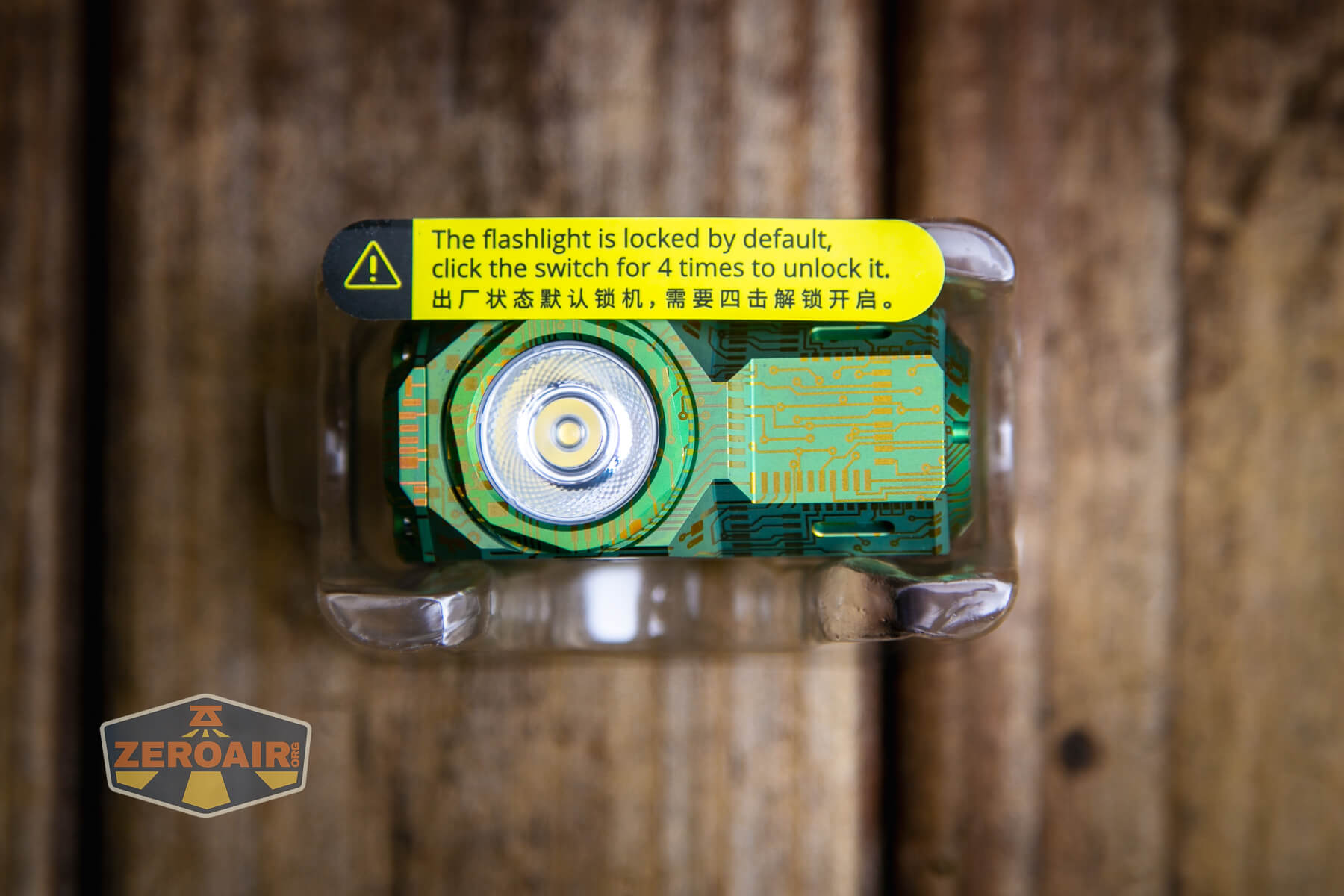 I did find the clip just a bit hard to use because the mouth is quite narrow and it’s across a flat part of the light (the whole light is flat parts!). Anyway, the carry isn’t as deep as I’d want to carry such a short light, so I would certainly carry this light deep in a pocket. I’d lock it out first.