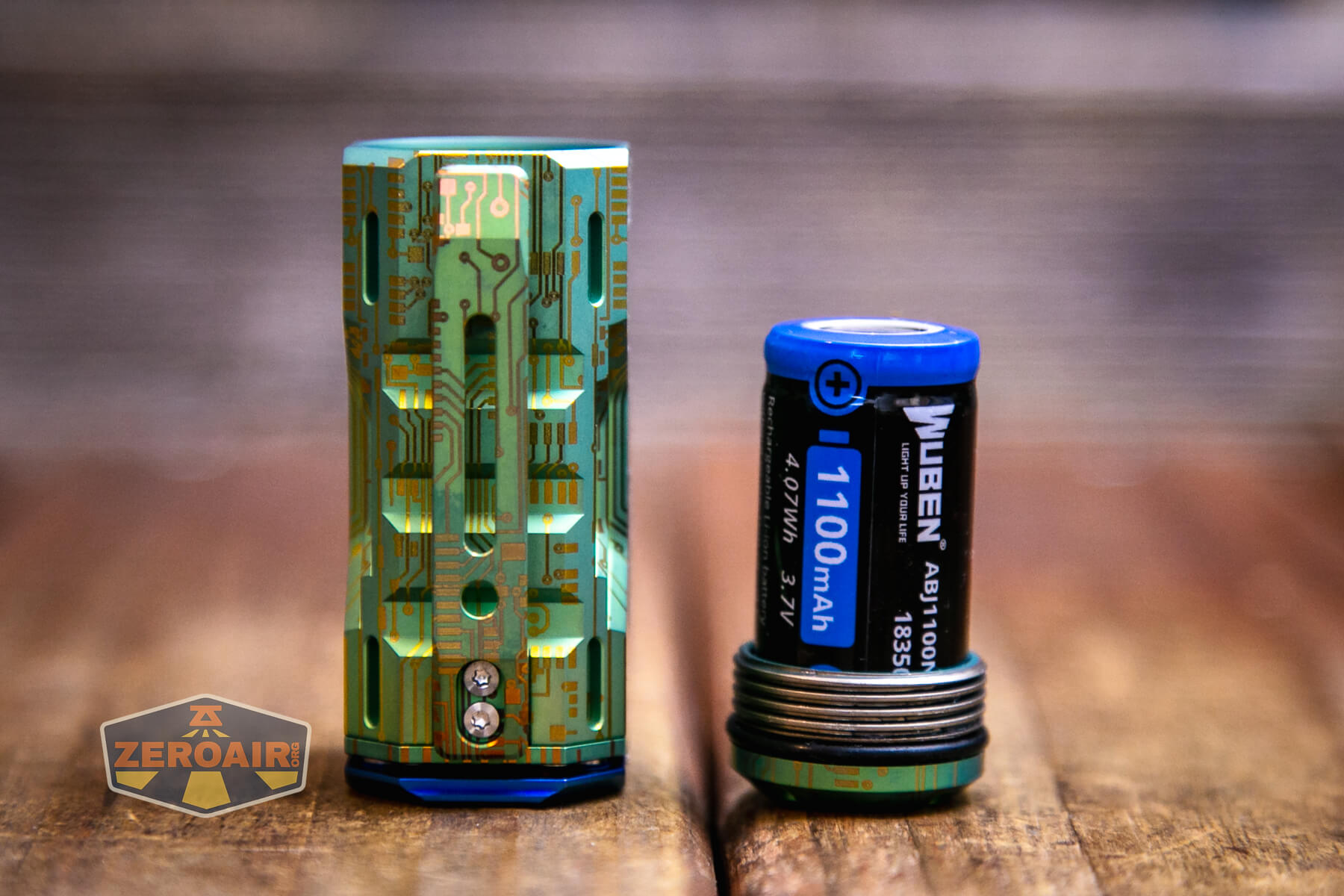 The Wuben X-0 Knight titanium flashlight runs on a single 18350 cell. The button-top cell you see below is included! Note the updated branding from the cell I received in the aluminum version.