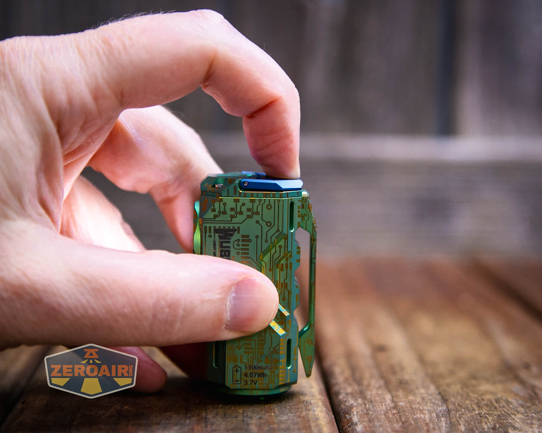 You’ll see it below, but there are two metal buttons for this metal cover to rest against. Interestingly, on the aluminum version, they used brass! But on the titanium version, they seem to have used stainless steel. When the cover goes from “up” (all the way up) to down, there’s a very pleasant ‘thonk’ that I can’t even describe. The cover has no bounce at all, and because of this thonk, it could be described adequately as a fidget toy, too. Turns out that those two brass buttons are springy, and “catch” the cover when it lands. It’s exceptionally pleasant.