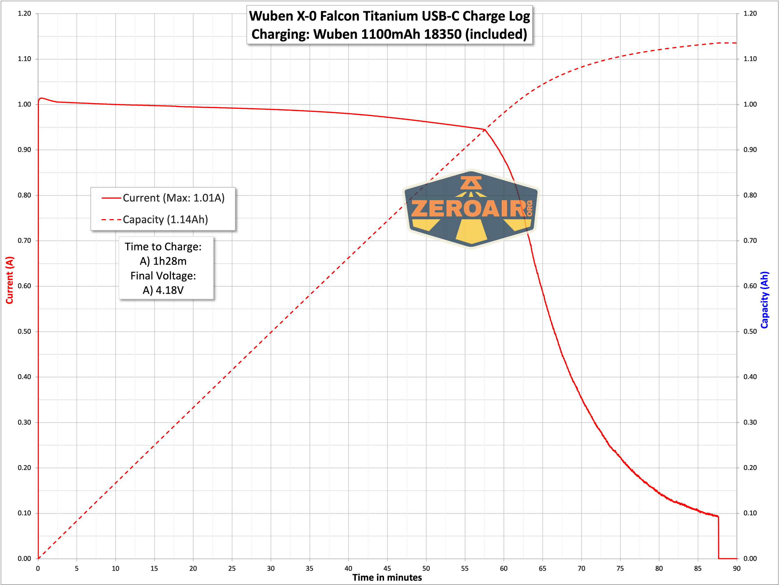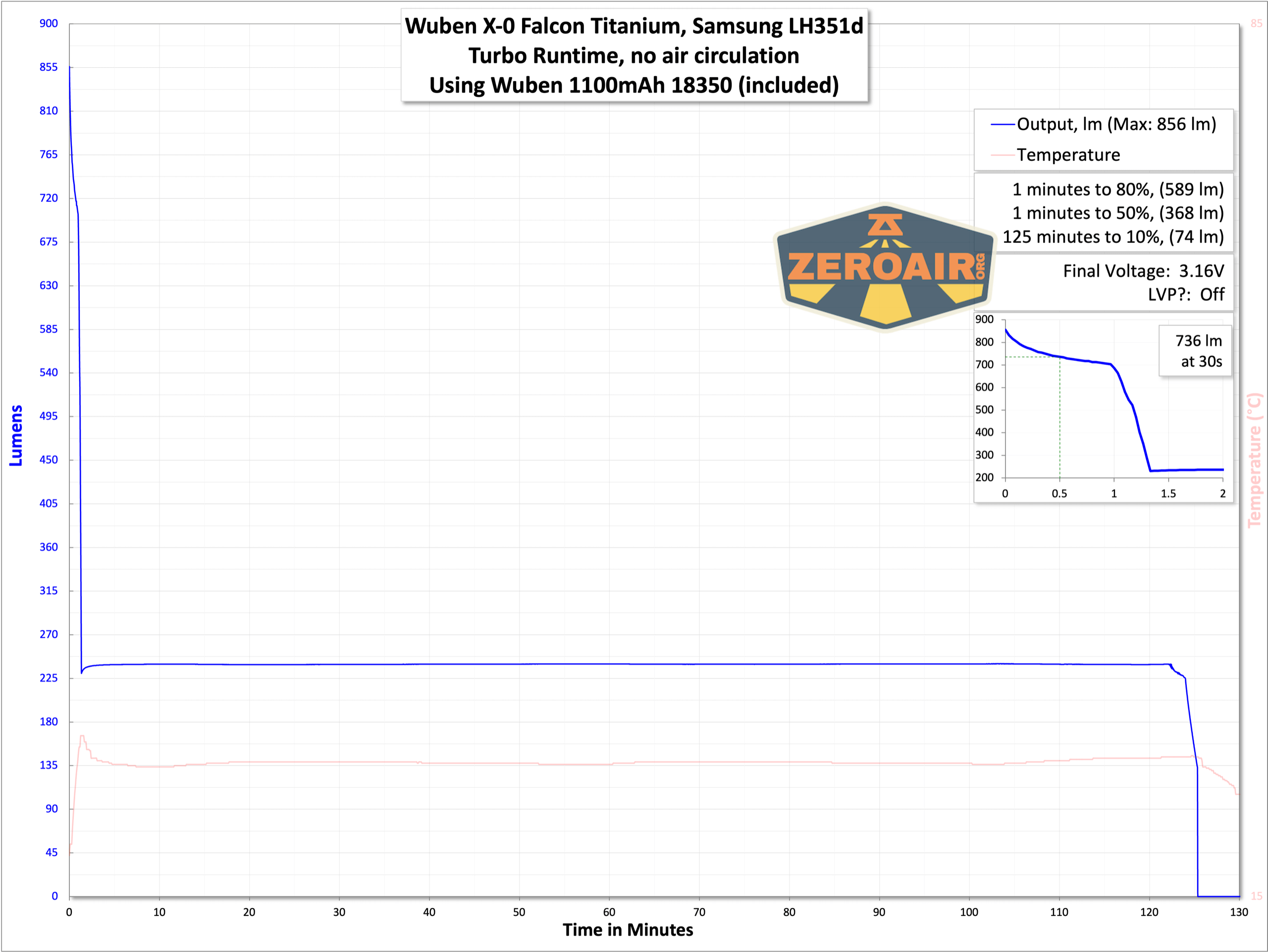Below are a few runtimes. Wuben seems to have reduced the claimed output for this Samsung version (or just updated the manual, more likely). That’s nice! I’m pleased to see around 1 minute at over 700 lumens. After that, the output (and output on all other modes, too) is extremely stable. Fantastic. The light shuts off when cell voltage gets low, too – around 2.8V or so.